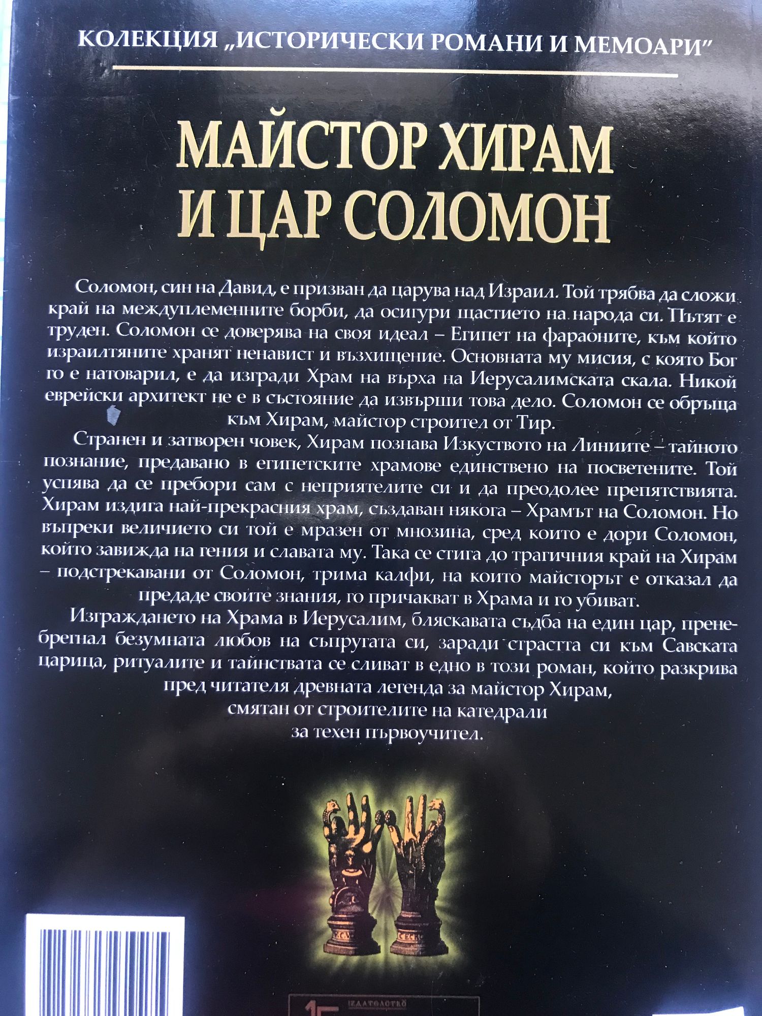 Соломон, син на Давид, е призван да царува над Израил. Той трябва да сложи край на междуплеменните борби, да осигури щастието на народа си. Пътят е труден. Соломон се доверява на своя идеал – Египет на фараоните, към който израилтяните хранят ненавист и възхищение. Основната му мисия, с която Бог го е натоварил, е да изгради Храм на върха на Иерусалимската скала. Никой еврейски архитект не е в състояние да извърши това дело. Соломон се обръща към Хирам, майстор строител от Тир. Странен и затворен човек, Хирам познава Изкуството на Линиите – тайното познание, предавано в египетските храмове единствено на посветените. Той успява да се пребори сам с неприятелите си и да преодолее препятствията. Хирам издига най-прекрасния храм, създаван някога – Храмът на Соломон. Но въпреки величието си той е мразен от мнозина, сред които е дори Соломон, който завижда на гения и славата му. Така се стига до трагичния край на Хирам – подстрекавани от Соломон, трима калфи, на които майсторът е отказал да предаде своите знания, го причакват в Храма и го убиват. Изграждането на Храма в Иерусалим, бляскавата съдба на един цар, пренебрегнал безумната любов на съпругата си, заради страстта си към Савската царица, ритуалите и тайнствата се сливат в едно в този роман, който разкрива пред читателя древната легенда за майстор Хирам, смятан от строителите на катедрали за техен първоучител.