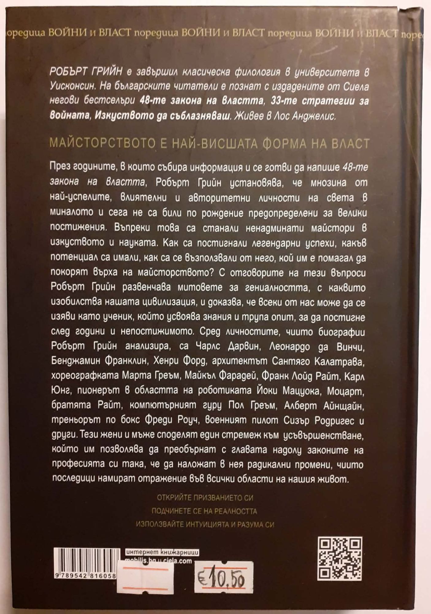 РОБЪРТ ГРИЙН е завършил класическа филология в университета в Уисконсин. На българските читатели е познат с издадените от Сиела негови бестселъри 48-те закона на властта, 33-те стратегии за войната, Изкуството да съблазняваш. Живее в Лос Анджелис. МАЙСТОРСТВОТО Е НАЙ-ВИСШАТА ФОРМА НА ВЛАСТ През годините, в които събира информация и се готви да напише 48-те закона на властта, Робърт Грийн установява, че мнозина от най-успелите, влиятелни и авторитетни личности на света в миналото и сега не са били по рождение предопределени за Велики постижения. Въпреки това са станали ненадминати майстори в изкуството и науката. Как са постигнали легендарни успехи, какъв потенциал са имали, как са се възползвали от него, кой им е помагал да покорят върха на майсторството? С отговорите на тези въпроси Робърт Грийн развенчава митовете за гениалността, с каквито изобилства нашата цивилизация, и доказва, че всеки от нас може да се изяви като ученик, който усвоява знания и трупа опит, за да постигне след години и непостижимото. Сред личностите, чиито биографии Робърт Грийн анализира, са Чарлс Дарвин, Леонардо да Винчи, Бенджамин Франклин, Хенри Форд, архитектът Сантяго Калатрава, хореографката Марта Греъм, Майкъл Фарадей, Франк Лойд Райт, Карл Юнг, пионерът в областта на роботиката Йоки Мацуока, Моцарт, братята Райт, компютърният гуру Пол Греъм, Алберт Айнщайн, треньорът по бокс Фреgu Роуч, военният пилот Сизър Родригес и други. Тези жени и мъже споделят един стремеж към усъвършенстване, който им позволява да преобърнат с главата надолу законите на професията си така, че да наложат в нея радикални промени, чиито последици намират отражение във всички области на нашия живот. ОТКРИЙТЕ ПРИЗВАНИЕТО си ПОДЧИНЕТЕ СЕ НА РЕАЛНОСТТА ИЗПОЛЗВАЙТЕ ИНТУИЦИЯТА И РАЗУМА СИ