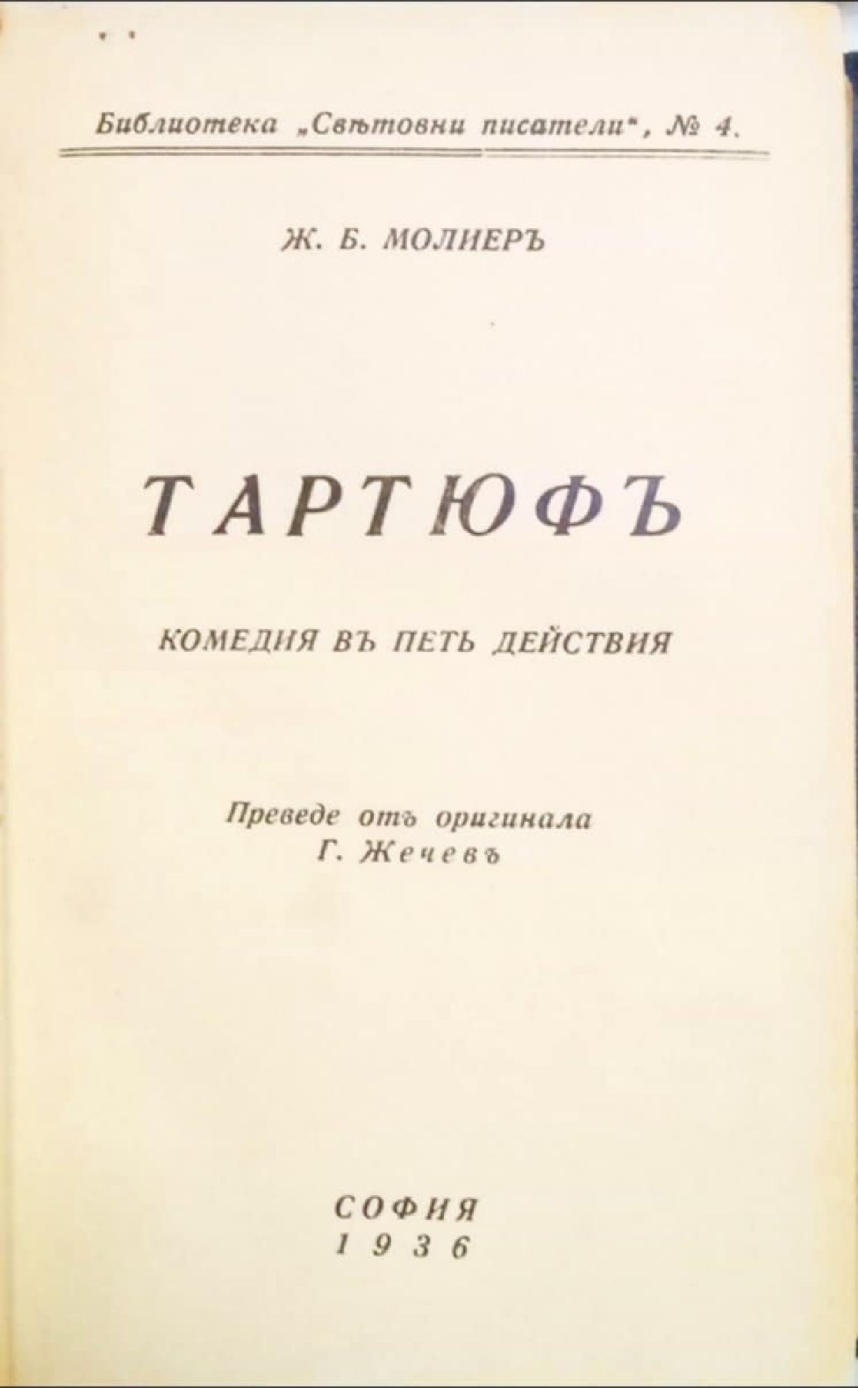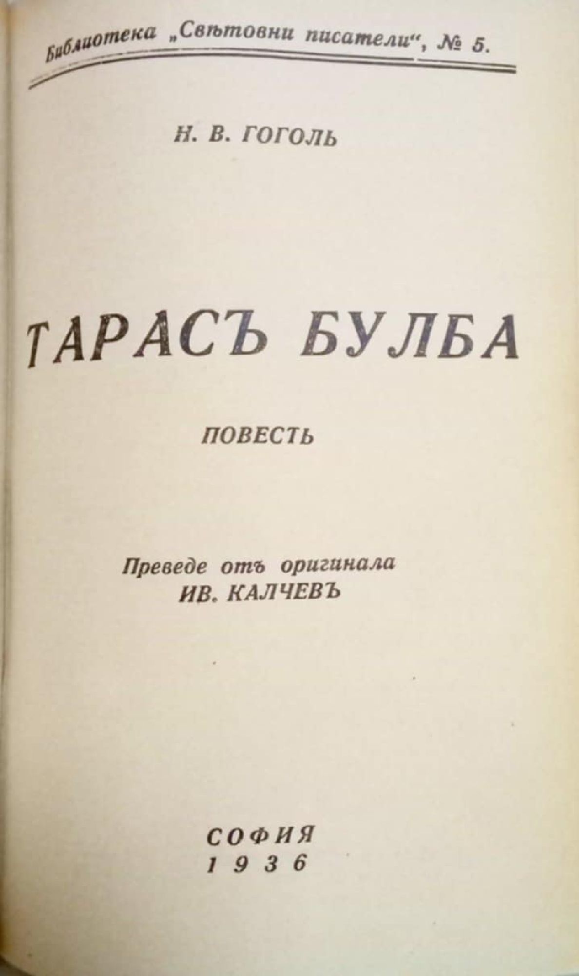 Конволют от пет антикварни книги с произведения от световната литературна класика: 1. Уилям Шекспир. Макбетъ (Макбет). Трагедия в петь действия. С., 1936, 73 с. 2. Ж. Б. Молиер. Тартюфъ (Тартюф). Комедия в петь действия. С., 1936, 72 с. 3. Гьоте. Херманъ и Доротея (Херман и Доротея). С., 1937, 78 с. 4. Н. В. Гогол. Тарасъ Булба (Тарас Булба). Повесть. С., 1936, 160 с. 5. Лев. Толстой. Детство и юношество. С., Б. г., 260 с.
