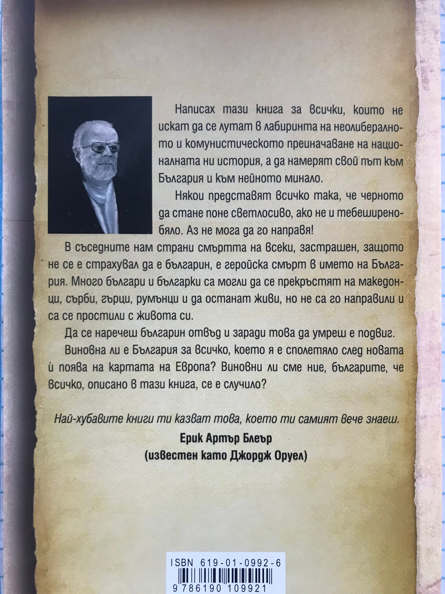 Написах тази книга за всички, които не искат да се лутат в лабиринта на неолибералното и комунистическото преиначаване на националната ни история, а да намерят свой път към България и към нейното минало. Някои представят всичко така, че черното да стане поне светлосиво, ако не и тебеширенобяло. Аз не мога да го направя! В съседните нам страни смъртта на всеки, застрашен, защото не се е страхувал да е българин, е геройска смърт в името на България. Много българи и българки са могли да се прекръстят на македонци, сърби, гърци, румънци и да останат живи, но не са го направили и са се простили с живота си. Да се наречеш българин отвъд и заради това да умреш е подвиг. Виновна ли е България за всичко, което я е сполетяло след новата й поява на картата на Европа? Виновни ли сме ние, българите, че всичко, описано в тази книга, се е случило? Най-хубавите книги ти казват това, което ти самият вече знаеш. Ерик Артър Блеър (известен като Джордж Оруел)