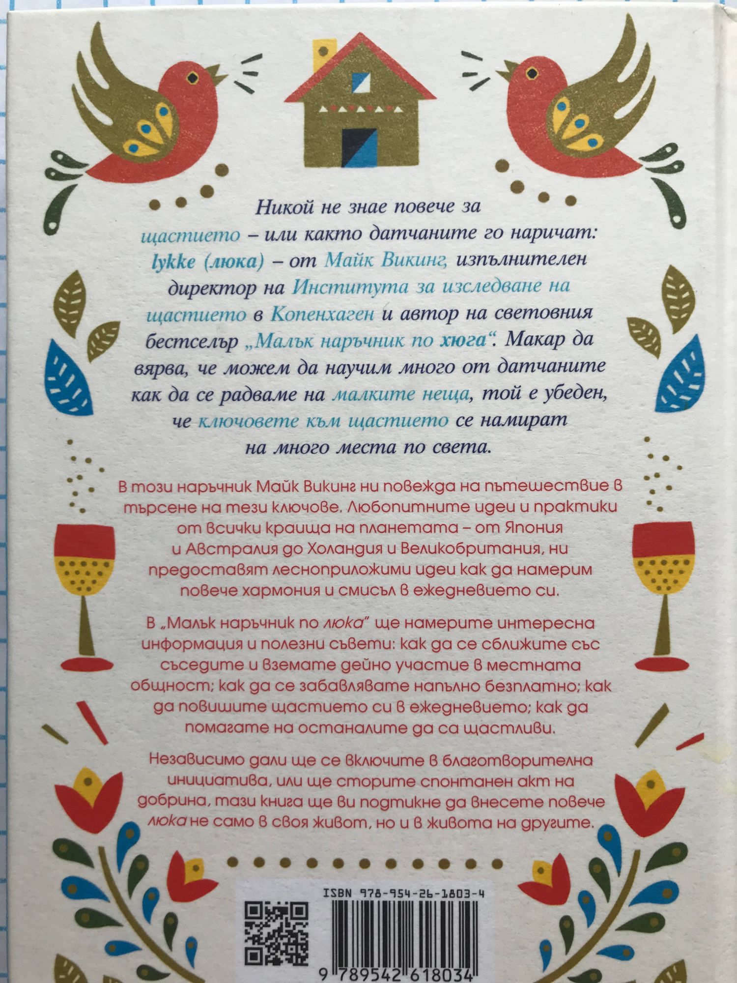 Никой не знае повече за щастието – или както датчаните го наричат: lykke (люка) – от Майк Викинг, изпълнителен директор на Института за изследване на щастието в Копенхаген и автор на световния бестселър „Малък наръчник по хюга“. Макар да вярва, че можем да научим много от датчаните как да се радваме на малките неща, той е убеден, че ключовете към щастието се намират на много места по света. В този наръчник Майк Викинг ни повежда на пътешествие в търсене на тези ключове. Любопитните идеи и практики от всички краища на планетата – от Япония и Австралия до Холандия и Великобритания, ни предоставят лесноприложими идеи как да намерим повече хармония и смисъл в ежедневието си. В „Малък наръчник по люка“ ще намерите интересна информация и полезни съвети: как да се сближите със съседите и вземате дейно участие в местната общност; как да се забавлявате напълно безплатно; как да повишите щастието си в ежедневието; как да помагате на останалите да са щастливи. Независимо дали ще се включите в благотворителна инициатива, или ще сторите спонтанен акт на добрина, тази книга ще ви подтикне да внесете повече люка не само в своя живот, но и в живота на другите.