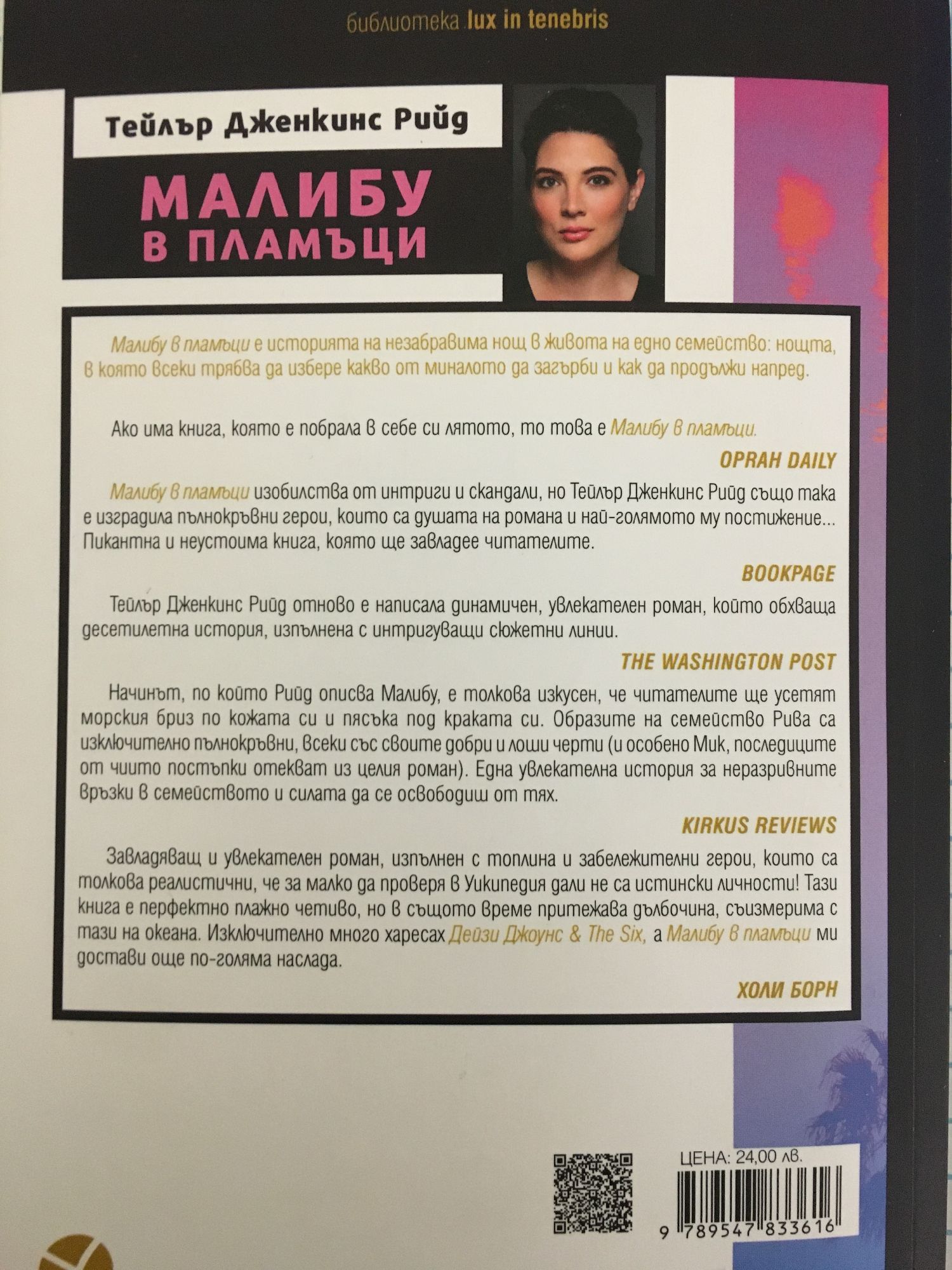 Четирите деца на прочутото семейство Рива организират традиционното си парти по случай края на лятото. Но в рамките на двайсет и четири часа животът им ще се промени завинаги. Малибу, август 1983 г. Кипи трескавата подготовка за ежегодното парти на Нина Рива. Всички искат да се докоснат до прочутото семейство Рива: Нина, талантливата сърфистка и топмодел; братята ѝ Джей и Хъд, единият - шампион по сърфинг, другият - уважаван фотограф; и малката им сестра Кит. Братята и сестрите са обект на голямо внимание не само в Малибу, но и по целия свят - отчасти тъй като са деца на легендарния певец Мик Рива. Единственият човек, който няма желание да участва в купона, е самата Нина. Тя никога не е искала да бъде център на вниманието, а отгоре на всичко съвсем наскоро е била подложена на публично унижение, когато съпругът ѝ - известен тенисист - я изоставя. И може би Хъд - защото трябва да направи дълго отлагано признание пред брат си, с когото цял живот са били неразделни. Джей, от своя страна, брои нетърпеливо минутите до началото на партито, когато ще види момичето, което е завладяло мислите и сърцето му. Кит също има тайни - включително неочаквания гост, когото тайно е поканила. В полунощ на партито вече ще цари пълен хаос. На сутринта имението на Рива ще бъде изпепелено от пожар. Но преди първата искра да припламне, алкохолът ще се лее, музиката ще гърми и на бял свят ще излязат дълго пазени тайни. Малибу в пламъци е историята на незабравима нощ в живота на едно семейство: нощта, в която всеки трябва да избере какво от миналото да загърби и как да продължи напред. Книгата е част от поредицата Lux In Tenebris на издателство Intense.