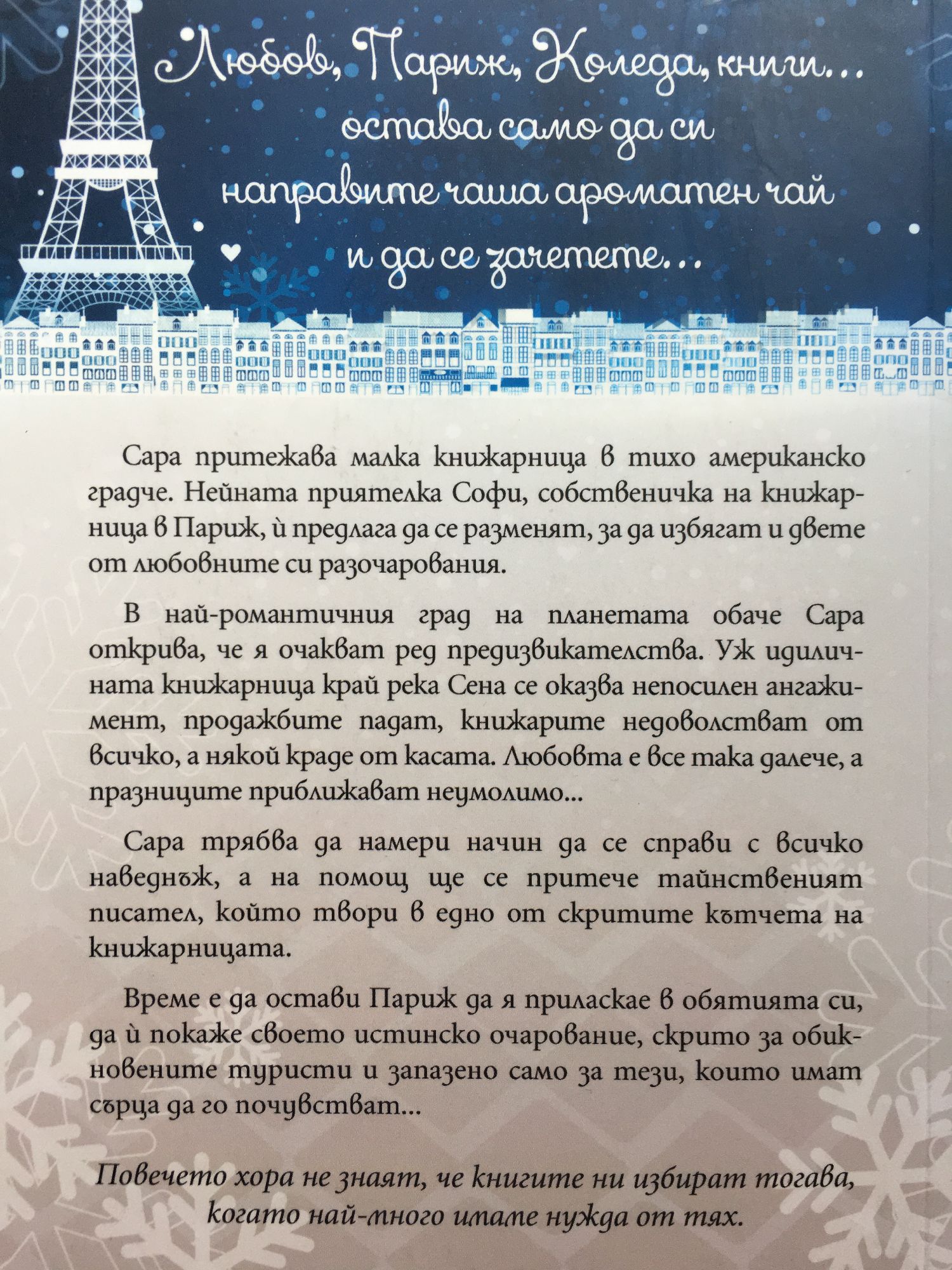 Любов, Париж, Коледа, книги… остава само да си направите чаша ароматен чай и да се зачетете… Сара притежава малка книжарница в тихо американско градче. Нейната приятелка Софи, собственичка на книжарница в Париж, й предлага да се разменят, за да избягат и двете от любовните си разочарования. В най-романтичния град на планетата обаче Сара открива, че я очакват ред предизвикателства. Уж идиличната книжарница край река Сена се оказва непосилен ангажимент, продажбите падат, книжарите недоволстват от всичко, а някой краде от касата. Любовта е все така далеч, а празниците наближават неумолимо... Сара трябва да намери начин да се справи с всичко наведнъж, а на помощ ще се притече тайнственият писател, който твори в едно от скритите кътчета на книжарницата. Време е да остави Париж да я приласкае в обятията си, да й покаже своето истинско очарование, скрито за обикновените туристи и запазено само за тези, които имат сърца да го почувстват… Повечето хора не знаят, че книгите ни избират тогава, когато най-много имаме нужда от тях.