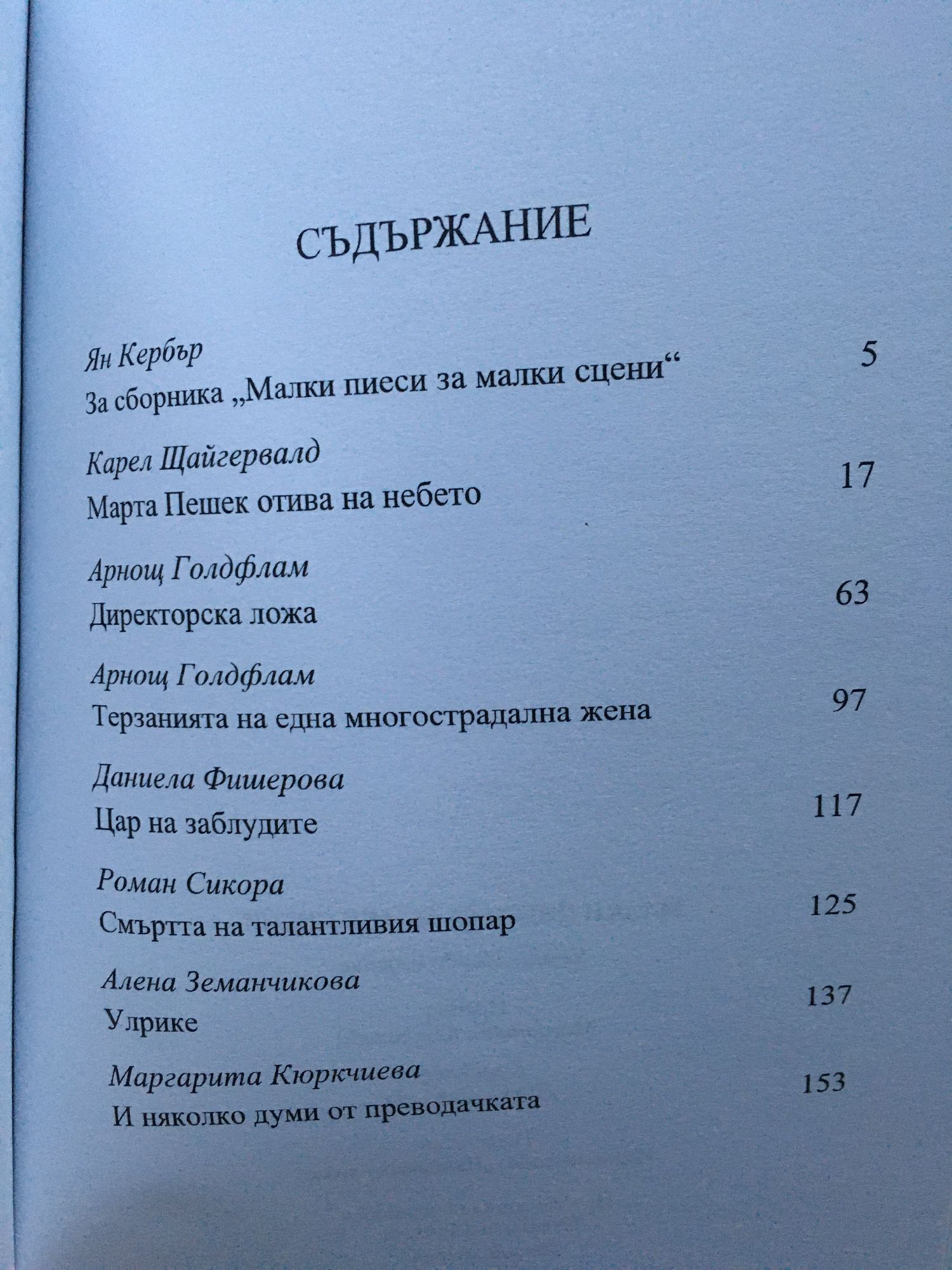 В сборника: Ян Кербър За сборника „Малки пиеси за малки сцени“ Карел Щайгервалд Марта Пешек отива на небето Арнощ Голдфлам Директорска ложа Арнощ Голдфлам Терзанията на една многострадална жена Даниела Фишерова Цар на заблудите Роман Сикора Смъртта на талантливия шопар Алена Земанчикова Улрике Маргарита Кюркчиева И няколко думи от преводачката