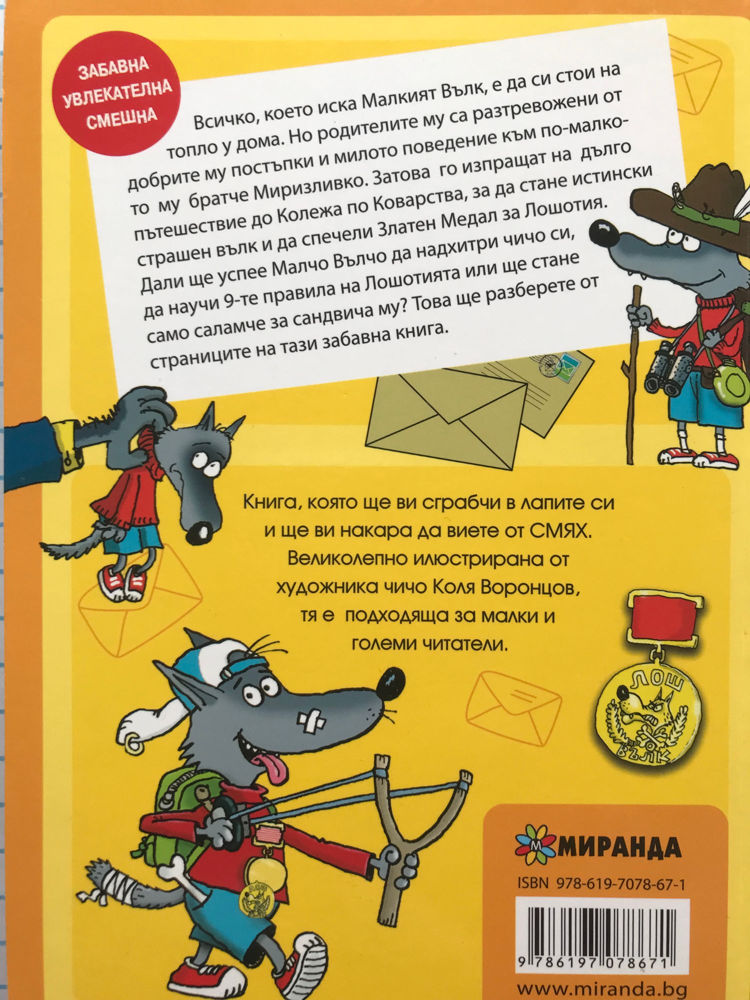Всичко, което иска Малкият Вълк, е да си стои на топло у дома. Но родителите му са разтревожени от добрите му постъпки и милото поведение към по-малкото му братче Миризливко. Затова го изпращат на дълго пътешествие до Колежа по Коварства, за да стане истински страшен вълк и да спечели Златен Медал за Лошотия. Дали ще успее Малчо Вълчо да надхитри чичо си, да научи 9-те правила на Лошотията или ще стане само саламче за сандвича му? Това ще разберете от страниците на тази забавна книга.