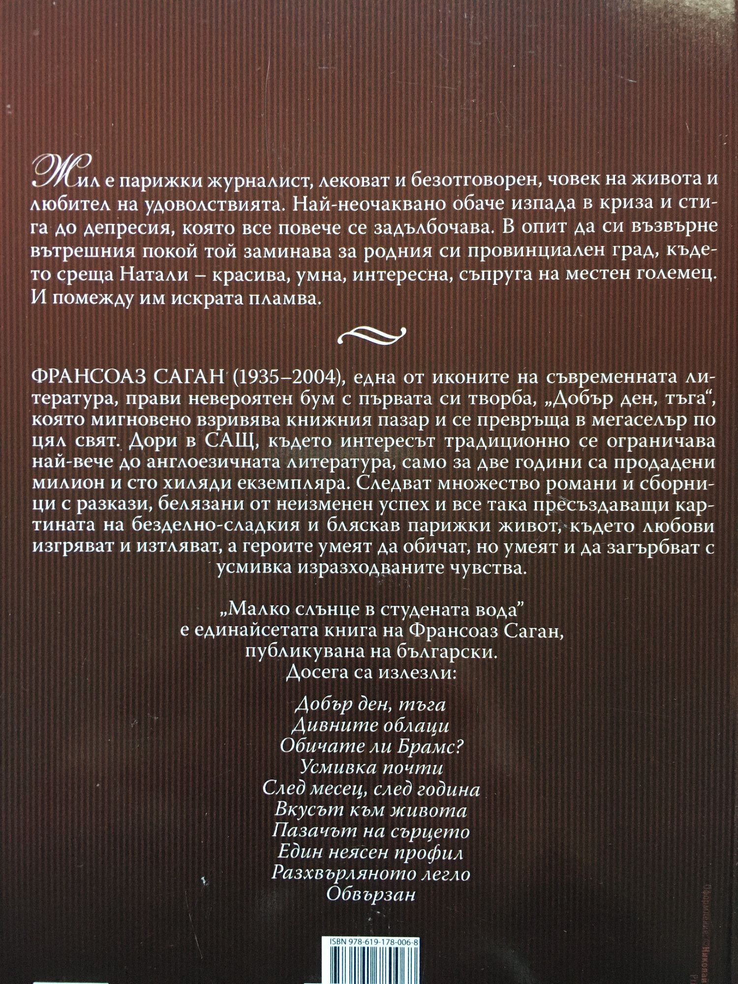 Жил е парижки журналист, лековат и безотговорен, човек на живота и любител на удоволствията. Най-неочаквано обаче изпада в криза и стига до депресия, която все повече се задълбочава. В опит да си възвърне вътрешния покой той заминава за родния си провинциален град, където среща Натали - красива, умна, интересна, съпруга на местен големец. И помежду им искрата пламва. Франсоаз Саган (1935-2004) е една от иконите на съвременната литература, прави невероятен бум с първата си творба “Добър ден, тъга“, която мигновено взривява книжния пазар и се превръща в мегаселър по цял свят. Дори в САЩ, където интересът традиционно се ограничава най-вече до англоезичната литература, само за две години са продадени милион и сто хиляди екземпляра. Следват множество романи и сборници с разкази, белязани от неизменим успех и все така пресъздаващи картината на безделно-сладкия и бляскав парижки живот, където любови изгряват и изтляват, а героите умеят да обичат, но умеят и да загърбват с усмивка изразходваните чувства. "Малко слънце в студената вода" е единайсетата книга на Франсоаз Саган, публикувана на български.