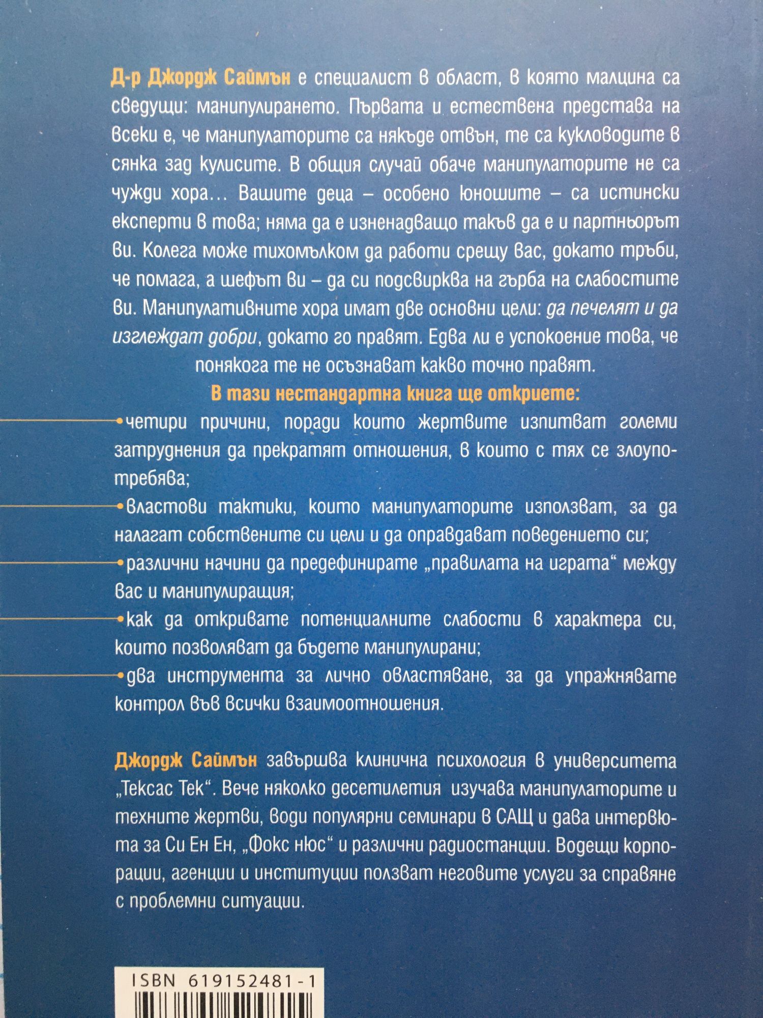 Д-р Джордж Саймън е специалист в област, в която малцина са сведущи: манипулирането. Първата и естествена представа на всеки е, че манипулаторите са някъде отвън, те са кукловодите в сянка зад кулисите. В общия случай обаче манипулаторите не са чужди хора… Вашите деца – особено юношите – са истински експерти в това; няма да е изненадващо такъв да е и партньорът ви. Колега може тихомълком да работи срещу вас, докато тръби, че помага, а шефът ви – да си подсвирква на гърба на слабостите ви. Манипулативните хора имат две основни цели: да печелят и да изглеждат добри, докато го правят. Едва ли е успокоение това, че понякога те не осъзнават какво точно правят. В тази нестандартна книга ще откриете: •четири причини, поради които жертвите изпитват големи затруднения да прекратят отношения, в които с тях се злоупотребява; •властови тактики, които манипулаторите използват, за да налагат собствените си цели и да оправдават поведението си; •различни начини да предефинирате „правилата на играта“ между вас и манипулиращия; •как да откривате потенциалните слабости в характера си, които позволяват да бъдете манипулирани; •два инструмента за лично овластяване, за да упражнявате контрол във всички взаимоотношения. Джордж Саймън завършва клинична психология в университета „Тексас Тек“. Вече няколко десетилетия изучава манипулаторите и техните жертви, води популярни семинари в САЩ и дава интервюта за Си Ен Ен, „Фокс нюс“ и различни радиостанции. Водещи корпорации, агенции и институции ползват неговите услуги за справяне с проблемни ситуации.