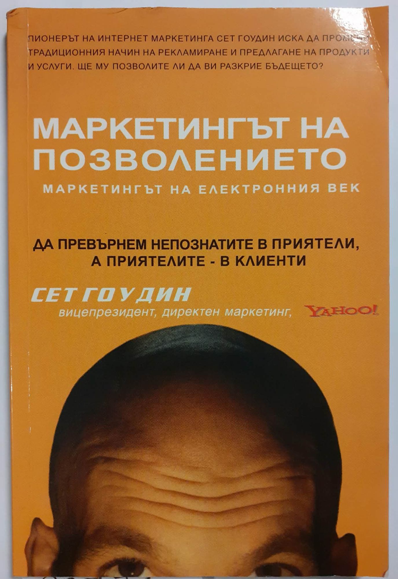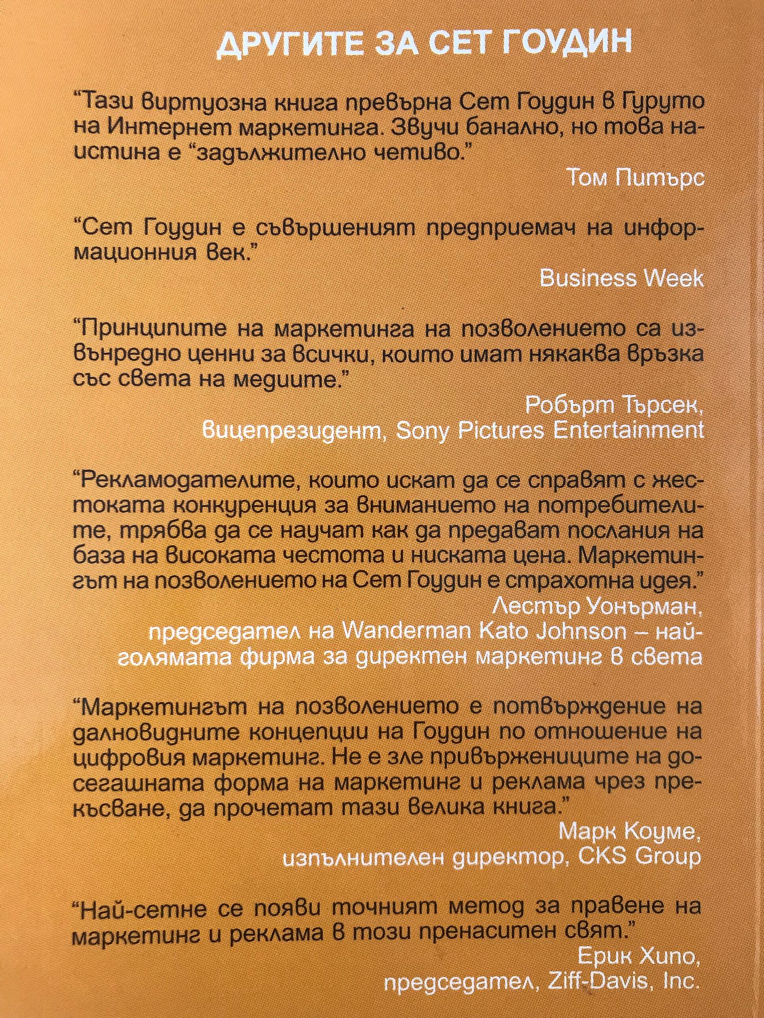 Човекът, който Business Week нарече "абсолютният предприемач на Информационния век" обяснява явлението "маркетинг на позволението" - фундаментално нова концепция, която дава възможност на маркетинг специалистите да оформят своето послание така, че потребителите с удоволствие да го възприемат. Телевизионни реклами прекъсват любимото ни предаване, агенти на фирми за телемаркетинг не се колебаят да ни обезпокоят, т.е. формите на традиционния начин на рекламиране се базират на идеята да откъснат вниманието ни от това, което правим в момента. Сет Гоудин нарича този подход "маркетинг на прекъсването" и твърди, че той вече не води до адекватни резултати. Вместо да безпокоят потенциалните си клиенти като прекъсват най-ценната им стока - тяхното време - привържениците на маркетинга на позволението мотивират потребителите да приемат рекламата доброволно. Авторът представя съвсем различно тълкуване на рекламиране на стоки и услуги. Като осъществява контакт само с онези, които са проявили интерес желание да получат повече информация за съответната стока, маркетингът на позволението помага на компаниите да установят дългосрочни взаимоотношения с клиентите си, да изградят доверие, да бъдат осведомени за търговската марка и осезателно да увеличат шансовете за продажба. В тази задълбочена и проницателна книга авторът предлага четири теста, които биха помогнали на практикуващите маркетинг на позволението: 1.Прилаганите от вас рекламни и маркетингови техники активизират ли двустранно взаимоотношение с клиентите ви? Мотивират ли ги "да вдигнат ръка" и да поискат диалог? 2.Разполагате ли с база от позволение? Следите ли броя на хората, които ви позволяват да общувате с тях?