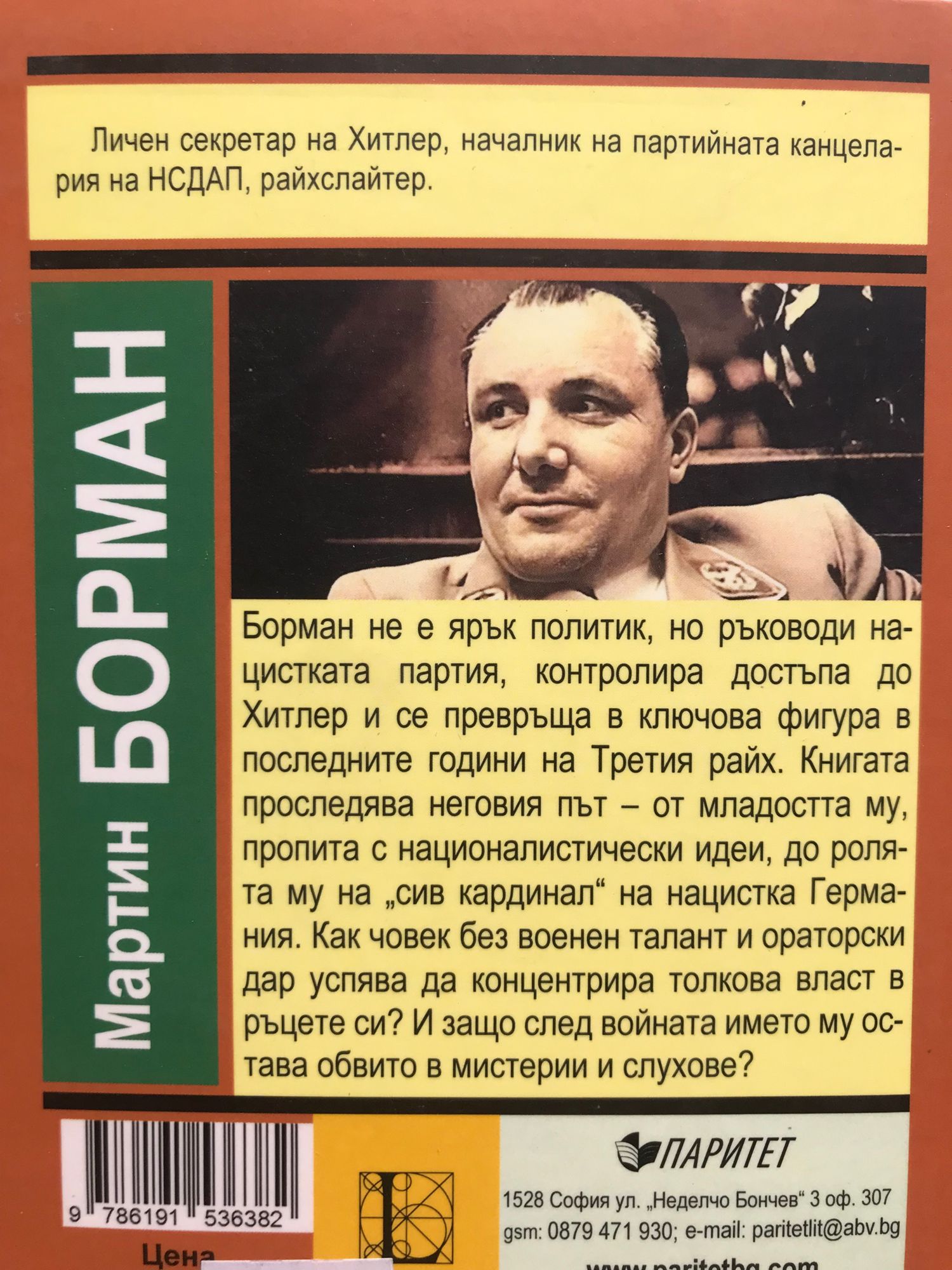 Личен секретар на Хитлер, началник на партийната канцелария на НСДАП, райхслайтер. Борман не е ярък политик, но ръководи нацистката партия, контролира достъпа до Хитлер и се превръща в ключова фигура в последните години на Третия райх. Книгата проследява неговия път – от младостта му, пропита с националистически идеи, до ролята му на „сив кардинал“ на нацистка Германия. Как човек без военен талант и ораторски дар успява да концентрира толкова власт в ръцете си? И защо след войната името му остава обвито в мистерии и слухове?