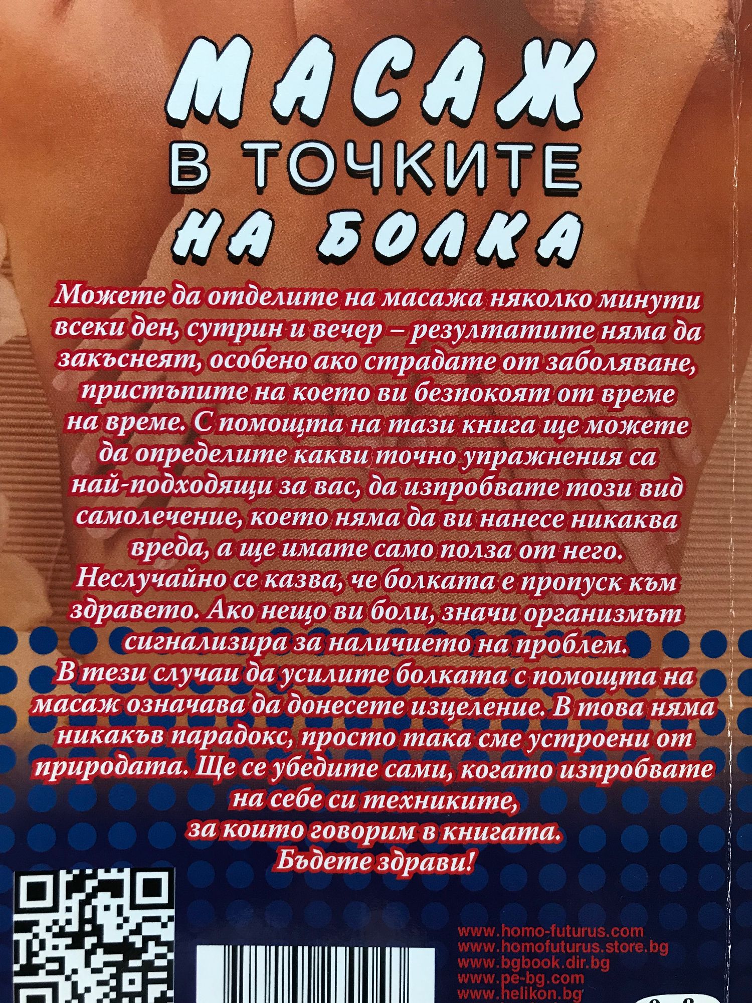 Можете да отделите на масажа няколко минути сутрин и вечер - резултатите няма да закъснеят, особено ако страдате от заболяване, пристъпите на което ви безпокоят от време на време. С помощта на тази книга ще можете да определите какви точно упражнения са най-подходящи за вас, да изпробвате този вид самолечение, което няма да нанесе никаква вреда, а ще имате само полза от него. Неслучайно се казва, че болката е пропуск към здравето. Ако нещо ви боли, значи организмът сигнализира за наличието на проблем. В тези случаи да усилите болката с помощта на масаж означава да донесете изцеление. В това няма никакъв парадокс, просто така сме устроени от природата. Ще се убедите сами, когато изпробвате на себе си техниките, за които говорим в книгата.