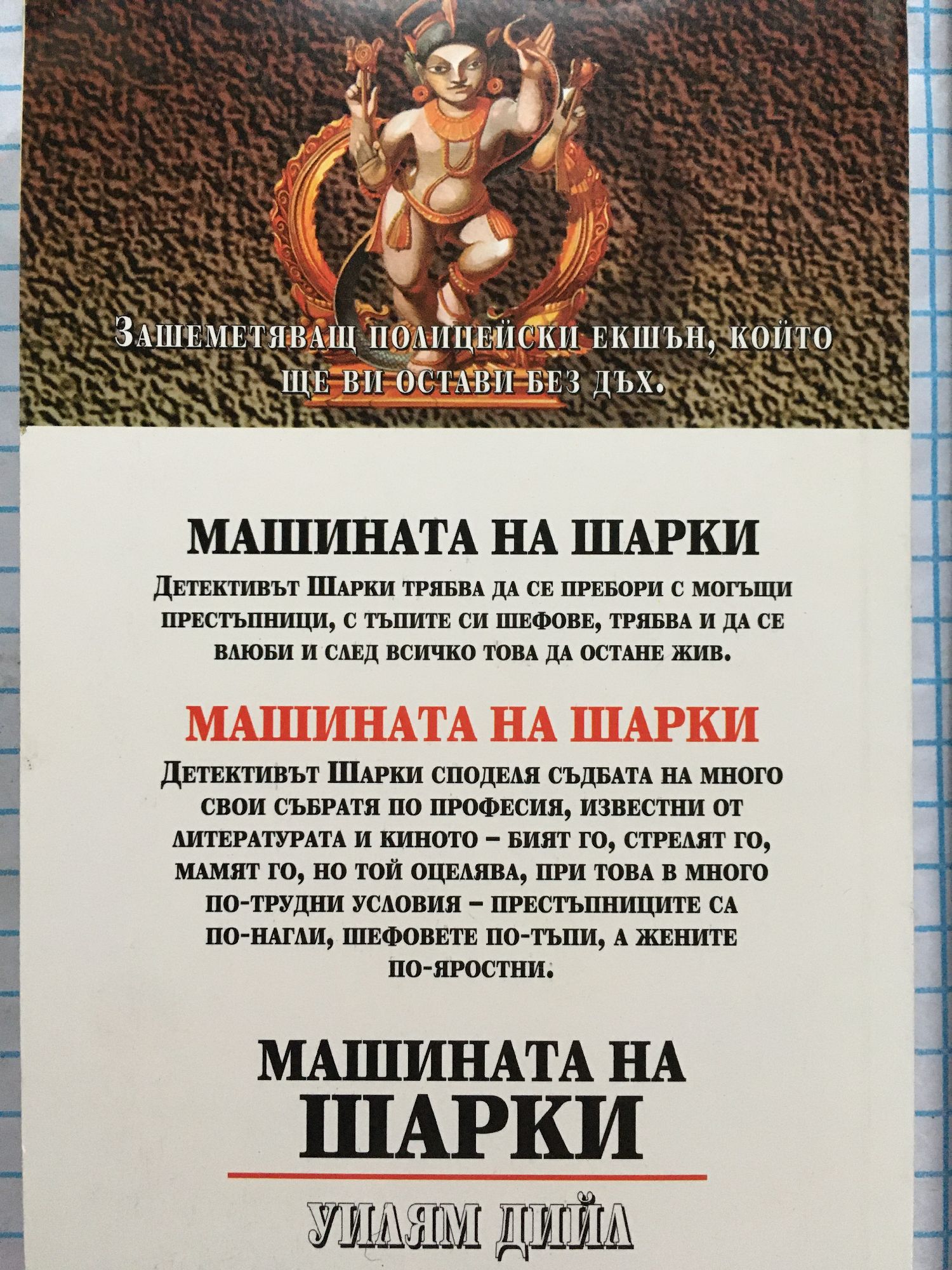 Детективът Шарки трябва да се пребори с могъщи престъпници, с тъпите си шефове, трябва и да се влюби и след всичко това да остане жив. МАШИНАТА НА ШАРКИ Детективът Шарки споделя съдбата на много свои събратя по професия, известни от литературата и киното - бият го, стрелят го, мамят го, но той оцелява, при това в много по-трудни условия - престъпниците са по-нагли, шефовете по-тъпи, а жените - по-яростни.