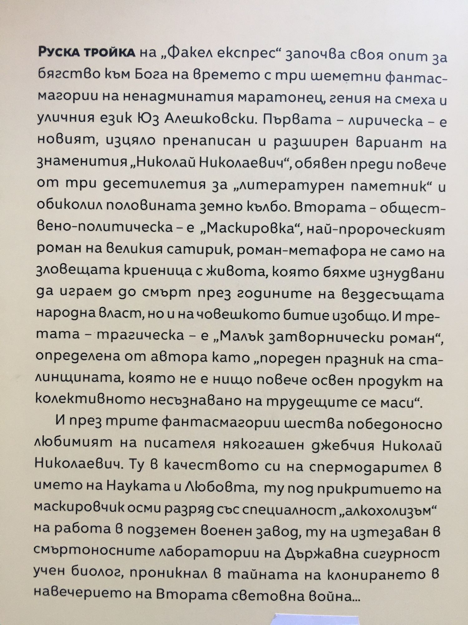 "Руска тройка" на "Факел Експрес" започва своя опит за бягство към Бога на времето с три шеметни фантасмагории на ненадминатия маратонец, гения на смеха и уличния език Юз Алешковски. Първата - лирическа - е новият, изцяло пренаписан и разширен вариант на знаменития "Николай Николаевич", обявен преди повече от три десетилетия за "литературен паметник" и обиколил половината земно кълбо. Втората - обществено-политическа - е "Маскировка", най-пророческият роман на великия сатирик, роман-метафора не само на зловещата криеница с живота, която бяхме изнудвани да играем до смърт през годините на вездесъщата народна власт, но и на човешкото битие изобщо. И третата - трагическа - е "Малък затворнически роман", определена от автора като "пореден празник на сталинщината, която не е нищо повече освен продукт на колективното несъзнавано на трудещите се маси". И през трите фантасмагории шества победоносно любимият на писателя някогашен джебчия Николай Николаевич. Ту в качеството си на спермодарител в името на Науката и Любовта, ту под прикритието на маскировчик осми разряд със специалност "алкохолизъм" на работа в подземен военен завод, ту на изтезаван в смъртоносните лаборатории на Държавна сигурност учен биолог, проникнал в тайната на клонирането в навечерието на Втората световна война...