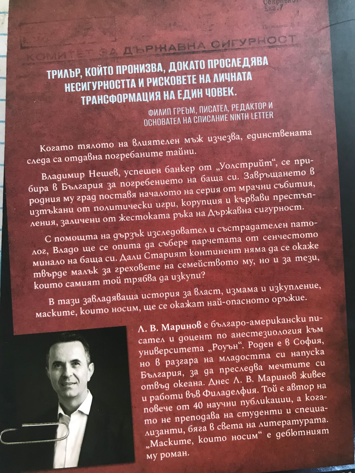 Когато тялото на влиятелен мъж изчезва, единствената следа са отдавна погребаните тайни. Владимир Нешев, успешен банкер от „Уолстрийт“, се прибира в България за погребението на баща си. Завръщането в родния му град поставя началото на серия от мрачни събития, изтъкани от политически игри, корупция и кървави престъпления, заличени от жестоката ръка на Държавна сигурност. С помощта на дързък изследовател и състрадателен патолог, Владо ще се опита да събере парчетата от сенчестото минало на баща си. Дали Старият континент няма да се окаже твърде малък за греховете на семейството му, но и за тези, които самият той трябва да изкупи? В тази завладяваща история за власт, измама и изкупление маските, които носим, ще се окажат най-опасното оръжие.