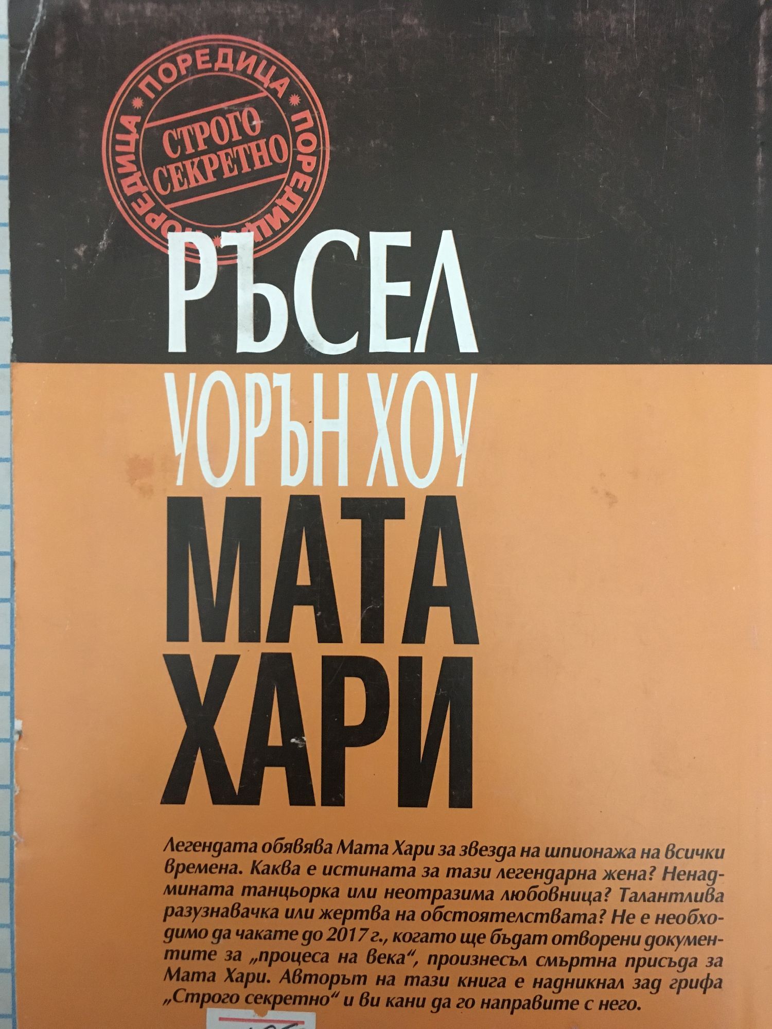 Легендата обвинява Мата Хари за звезда на шпионажа на всички времена. Каква е истината за тази легендарна жена? Талантлива разузнавачка или жертва на обстоятелствата?Ненадмината танцьорка или неотразима любовница? Не е необходимо да чакате до 2017г.,когато ще бъдат отворени документите за "процеса на века" ,произнесъл смъртна присъда за Мата Хари. Авторът на тази книга е надникнал в "Строго секретно" и ви кани да го направите и вие.