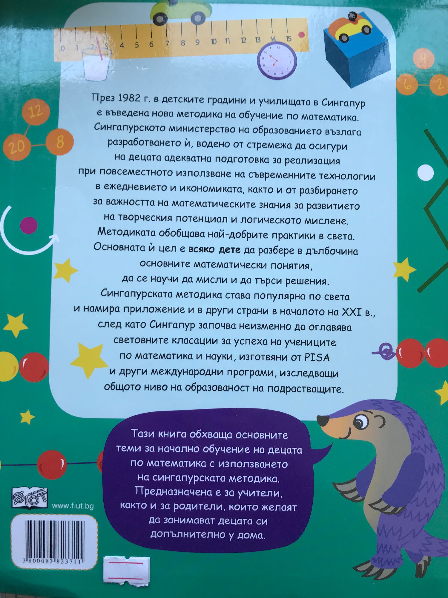 През 1982 г. в детските градини и училищата в Сингапур е въведена нова методика на обучение по математика. Сингапурското министерство на образованието възлага разработването ѝ, водено от стремежа да осигури на децата адекватна подготовка за реализация при повсеместното използване на съвременните технологии в ежедневието и икономиката, както и от разбирането за важността на математическите знания за развитието на творческия потенциал и логическото мислене. Методиката обобщава най-добрите практики в света. Основната ѝ цел е всяко дете да разбере в дълбочина основните математически понятия, да се научи да мисли и да търси решения. Сингапурската методика става популярна по света и намира приложение и в други страни в началото на XXI в., след като Сингапур започва неизменно да оглавява световните класации за успеха на учениците по математика и науки, изготвяни от PISA и други международни програми, изследващи общото ниво на образованост на подрастващите. Тази книга обхваща основните теми за начално обучение на децата по математика с използването на сингапурската методика. Предназначена е за учители, както и за родители, които желаят да занимават децата си допълнително у дома.