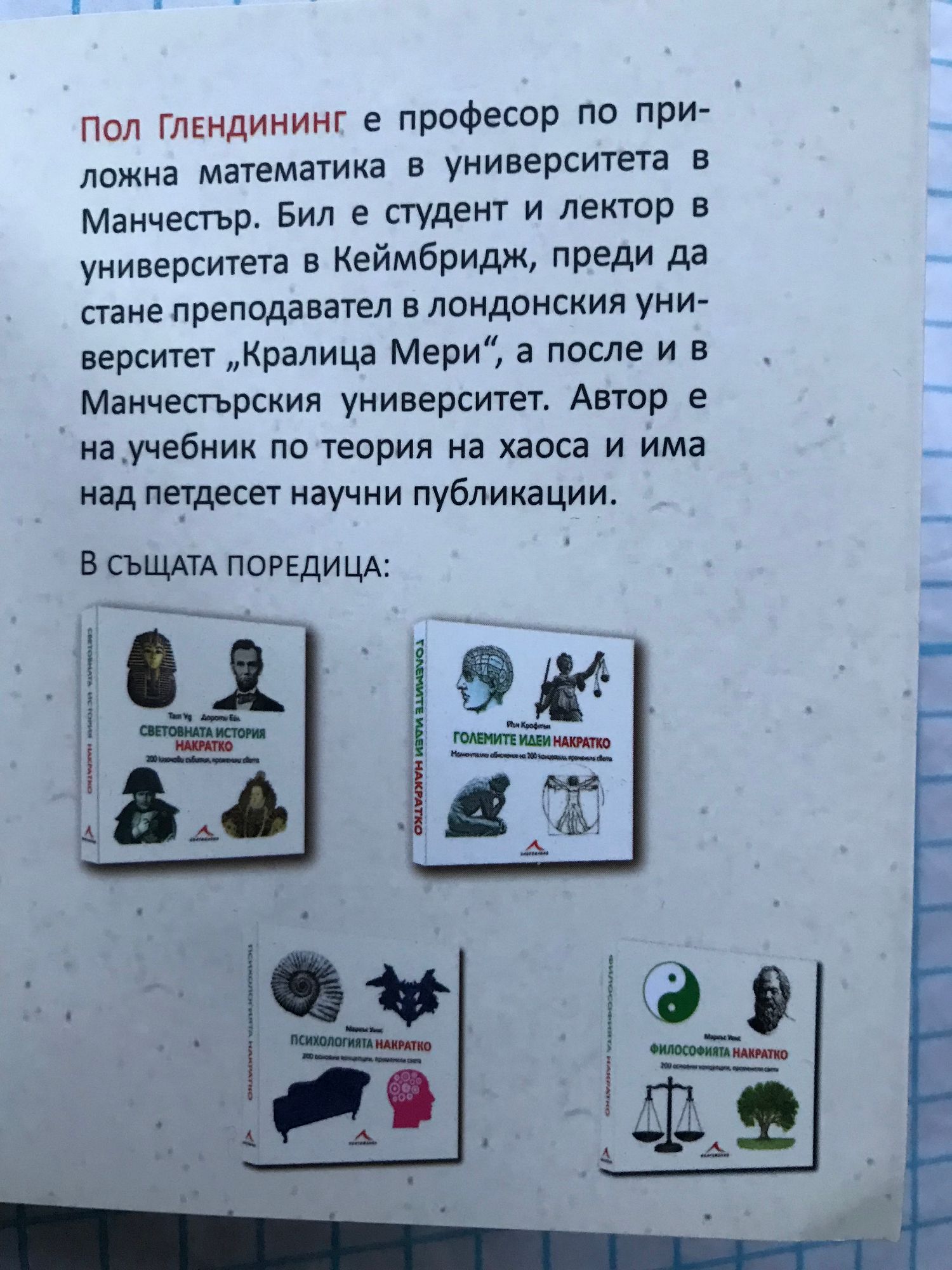 Пол Глендининг е професор по приложна математика в университета в Манчестър. Бил е студент и лектор в университета в Кеймбридж, преди да стане преподавател в лондонския университет „Кралица Мери”, а после и в Манчестърския университет. Автор е на учебник по теория на хаоса и има над петдесет научни публикации. Възможно най-бързият начин да научите всичко от простите числа до полиномите Изключително опростена и достъпна книгата „Математиката накратко” е визуализирано представяне на 200 ключови термина в математиката. Всеки един от тях е изложен разбираемо и лесно за запомняне, богато илюстриран с чертеж и дефиниция от максимум 200 думи. Терминологията покрива всички основни дялове в математиката, включително алгоритъма на Евклид, хотела на Хилберт, аксиомата на избора, вероятностите, редиците и редовете, парадокса на Зенон, мозайката на Пенроуз, векторите и матриците, групите, пръстените и полетата, теорията на хаоса, метричните пространства, фракталите, топологията и последната теорема на Ферма.