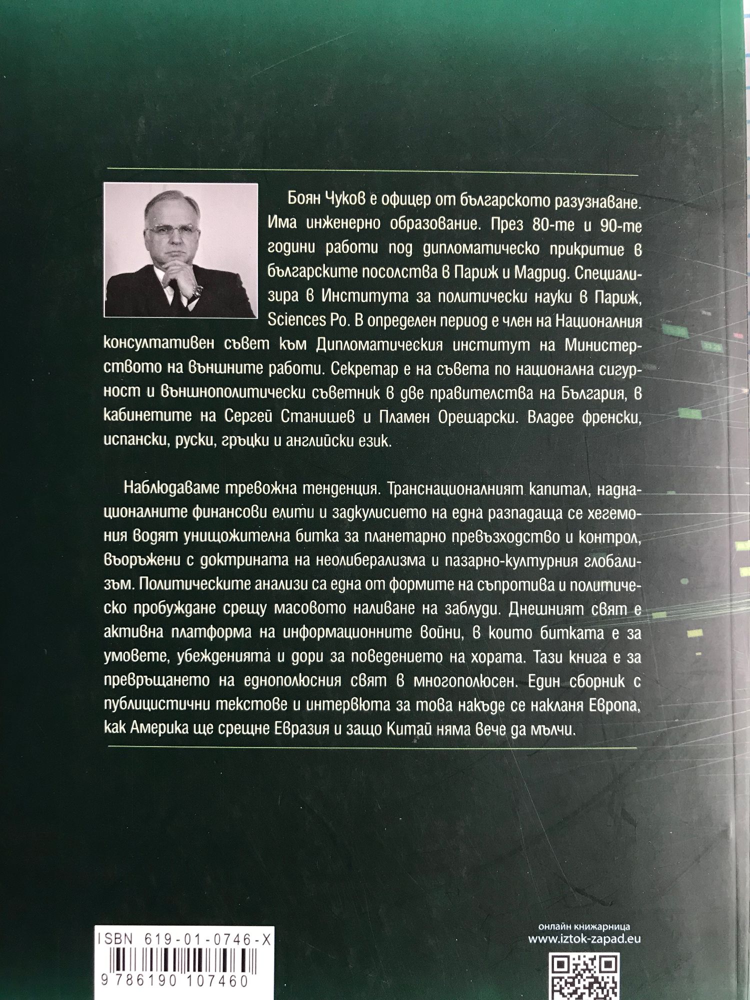 Наблюдаваме тревожна тенденция. Транснационалният капитал, наднационалните финансови елити и задкулисието на една разпадаща се хегемония водят унищожителна битка за планетарно превъзходство и контрол, въоръжени с доктрината на неолиберализма и пазарно-културния глобализъм. Политическите анализи са една от формите на съпротива и политическо пробуждане срещу масовото наливане на заблуди. Днешният свят е активна платформа на информационните войни, в които битката е за умовете, убежденията и дори за поведението на хората. Тази книга е за превръщането на еднополюсния свят в многополюсен. Един сборник с публицистични текстове и интервюта за това накъде се накланя Европа, как Америка ще срещне Евразия и защо Китай няма вече да мълчи. Боян Чуков е офицер от българското разузнаване. Има инженерно образование. През 80-те и 90-те години работи под дипломатическо прикритие в българските посолства в Париж и Мадрид. Специализира в Института за политически науки в Париж, Sciences Po. В определен период е член на Националния консултативен съвет към Дипломатическия институт на Министерството на външните работи. Секретар е на съвета по национална сигурност и външнополитически съветник в две правителства на България, в кабинетите на Сергей Станишев и Пламен Орешарски. Владее френски, испански, руски, гръцки и английски език.