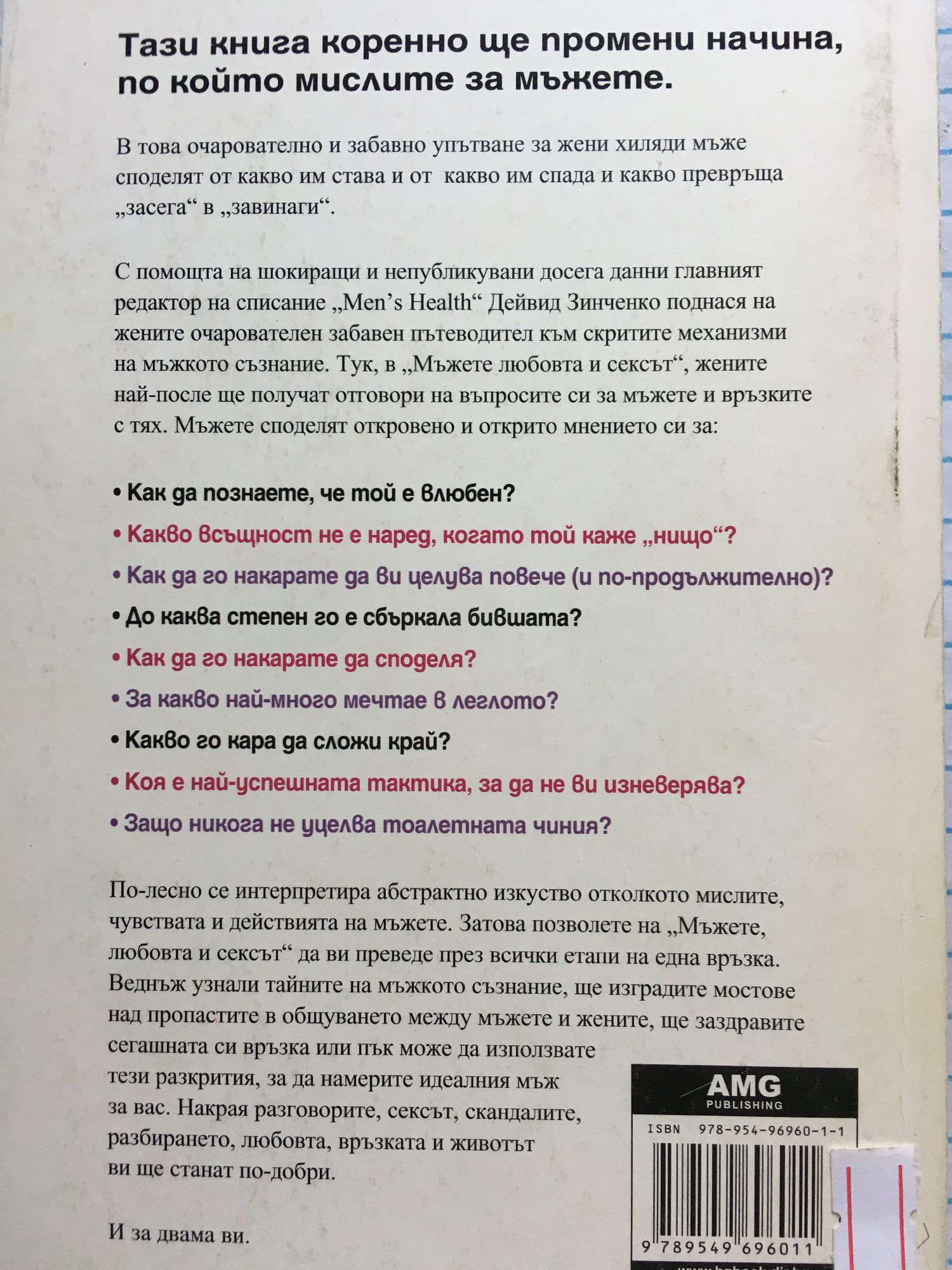Какво кара мъжа да се влюби? Защо мъжете изневеряват? Какво искат в леглото? Какво най-много искат от връзката? Изненадващите и проникновени отговори ще намерите тук – на страниците на „Мъжете, любовта и сексът”. Авторът на книгата Дейвид Зинченко – главен редактор на списание Men’s Health, използва резултатите от проучване на статистическата компания „Харис Интерактив”, проведено с повече от 5000 мъже и жени, и разшифрова мъжете – обяснява как действат, как мислят и какво искат от връзките си. Зинченко – автор на бестселъри от списъка на вестник „Ню Йорк Таймс” – използва статистически данни и лични впечатления на мъже, за да изясни всичко – от това, защо млъкват, когато се карате, до момента, в който разбират, че са намерили Жената. Това забавно и полезно упътване ще помогне на жените да разберат мъжете в живота си на всеки етап от връзката – първи срещи, караници, раздели, сдобрявания, брак и всичко останало – за да проникнат в често озадачаващото мъжко съзнание. Питате как ли? С помощта на рубрики, като: Кажи това, а не онова: Перфектните стратегии за комуникация, с които жените ще получат каквото искат и ще накарат мъжете да се разкрият! Овладени мъжки тайни: Невероятната истина за чувствата на мъжете и съвети, как да разберете на какъв етап точно се намира той! Най-добрият шифър за разгадаване на мъжете: Какво означава, ако той не остане за през нощта; когато ревнува до полуда; когато сумти, докато разговаряте; когато ви подари кухненски уред за рождения ден? Плюс разгадани хиляди други мъжки мистерии! Жените недоумяват: Отговори на най-трудните въпроси на жените относно мъжете. Защо не може да се извини? Защо не може да води спор като възрастен? Защо не уцелва тоалетната чиния? В „Мъжете, любовта и сексът” хиляди мъже признават какво чувстват и мислят за жените и секса и какво подпомага и какво пречи на отношенията им с тях. Отговорите, впечатленията и признанията им не само ще ви изненадат и разсмеят, но и ще ви помогнат да разберете мъжете значително по-добре, като междувременно ще укрепят връзката ви. Дайвид Зинченко е главен редактор на списание “Men‚s Health”, писал е тематични статии за вестниците “Ню Йорк Таймс”, “Лос Анджелис Таймс”, “Ю Ес Ей Тудей” и често е гост на предаването “Днес” на телевизия Ен Би Си по теми, свързани с мъжете и връзките. През 2003 г. попада в класацията на списание “Пийпъл” за 50-те най-желани ергени.