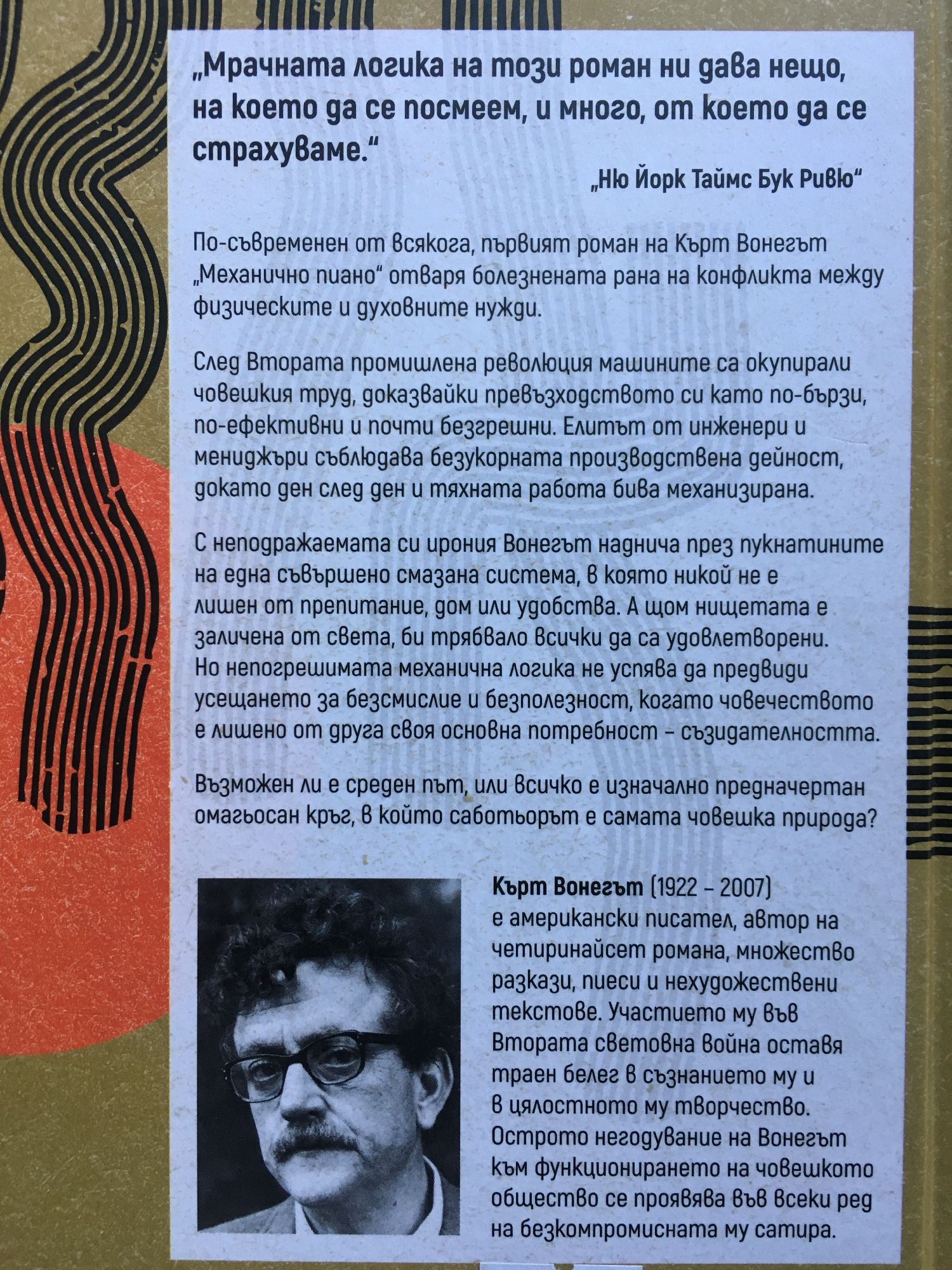 По-съвременен от всякога, първият роман на Кърт Вонегът „Механично пиано“ отваря болезнената рана на конфликта между физическите и духовните нужди. След Втората промишлена революция машините са окупирали човешкия труд, доказвайки превъзходството си като по-бързи, по-ефективни и почти безгрешни. Елитът от инженери и мениджъри съблюдава безукорната производствена дейност, докато ден след ден и тяхната работа бива механизирана. С неподражаемата си ирония Вонегът наднича през пукнатините на една съвършено смазана система, в която никой не е лишен от препитание, дом или удобства. А щом нищетата е заличена от света, би трябвало всички да са удовлетворени. Но непогрешимата механична логика не успява да предвиди усещането за безсмислие и безполезност, когато човечеството е лишено от друга своя основна потребност – съзидателността. Възможен ли е среден път, или всичко е изначално предначертан омагьосан кръг, в който саботьорът е самата човешка природа? „Мрачната логика на този роман ни дава нещо, на което да се посмеем, и много, от което да се страхуваме.“ „Ню Йорк Таймс Бук Ривю“