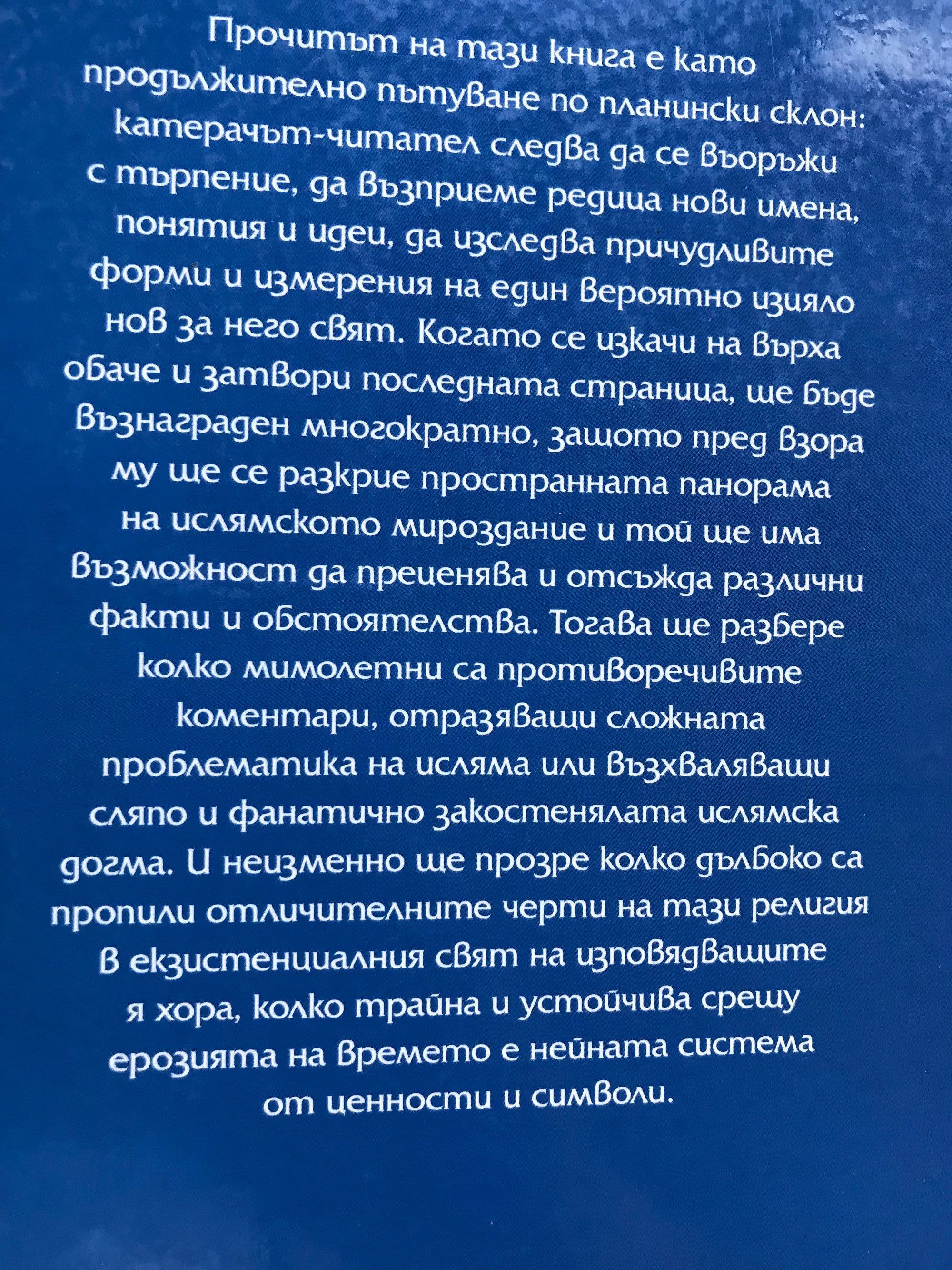 Прочитът на тази книга е като продължително пътуване по планински склон: катерачът-читател следва да се въоръжи с търпение, да възприеме редица нови имена, понятия и идеи, да изследва причудливите форми и измерения на един вероятно изцяло нов за него свят. Когато се изкачи на върха обаче и затвори последната страница, ще бъде възнаграден многократно, защото пред взора му ще се разкрие пространната панорама на ислямското мироздание и той ще има възможност да преценява и отсъжда различни факти и обстоятелства. Тогава ще разбере колко мимолетни са противоречивите коментари, отразяващи сложната проблематика на исляма или възхваляващи сляпо и фанатично закостенялата ислямска догма, и неизменно ще прозре колко дълбоко са пропили отличителните черти на тази религия в екзистенциалния свят на изповядващите я хора, колко трайна и устойчива срещу ерозията на времето е нейната система от ценности и символи.