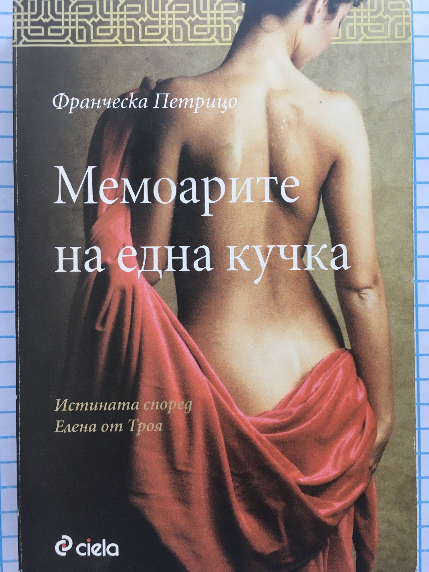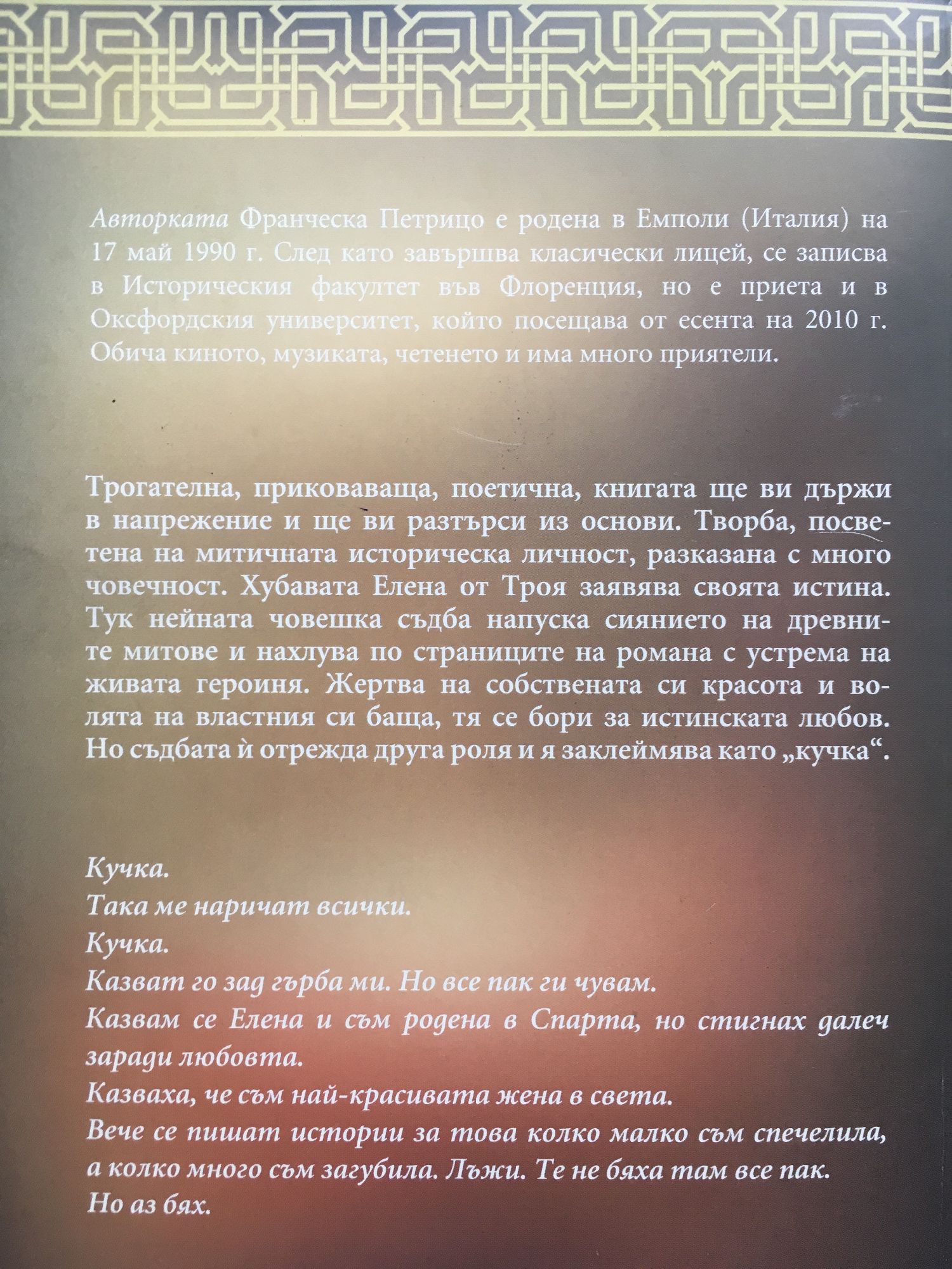 Франческа Петрицо е родена в Емполи /Италия/ през 1990 г. След като завършва класически лицей, се записва в Историческия факултет във Флоренция, но е приета и в Оксфордския университет, който посещава от есента на 2010 г. Обича киното, музиката, четенето и има много приятели. Трогателна, приковаваща, поетична, книгата ще ви държи в напрежение и ще ви разтърси из основи. Творба, посветена на митичната историческа личност, разказана с много човечност. Хубавата Елена от Троя заявява своята истина. Тук нейната човешка съдба напуска сиянието на древните митове и нахлува по страниците на романа с устрема на живата героиня. Жертва на собствената си красота и волята на властния си баща, тя се бори за истинската любов. Но съдбата й отрежда друга роля и я заклеймява като "кучка".