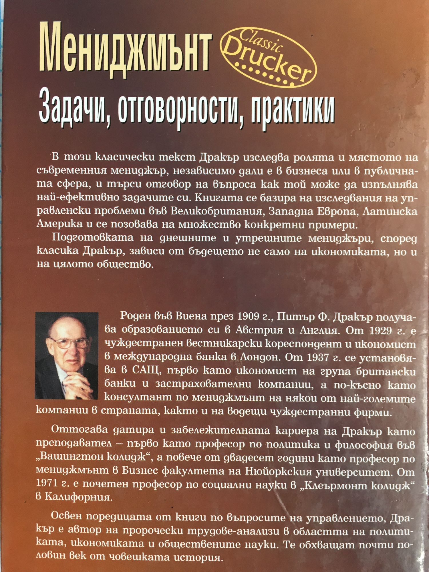 В този класически текст Дракър изследва ролята и мястото на съвременния мениджър, независимо дали е в бизнеса или в публичната сфера, и търси отговор на въпроса как той може да изпълнява най-ефективно задачите си. Книгата се базира на изследвания на управленски проблеми във Великобритания, Западна Европа, Латинска Америка и се позовава на множество конкретни примери. Подготовката на днешните и утрешните мениджъри, според класика Дракър, зависи от бъдещето не само на икономиката, но и на цялото общество.