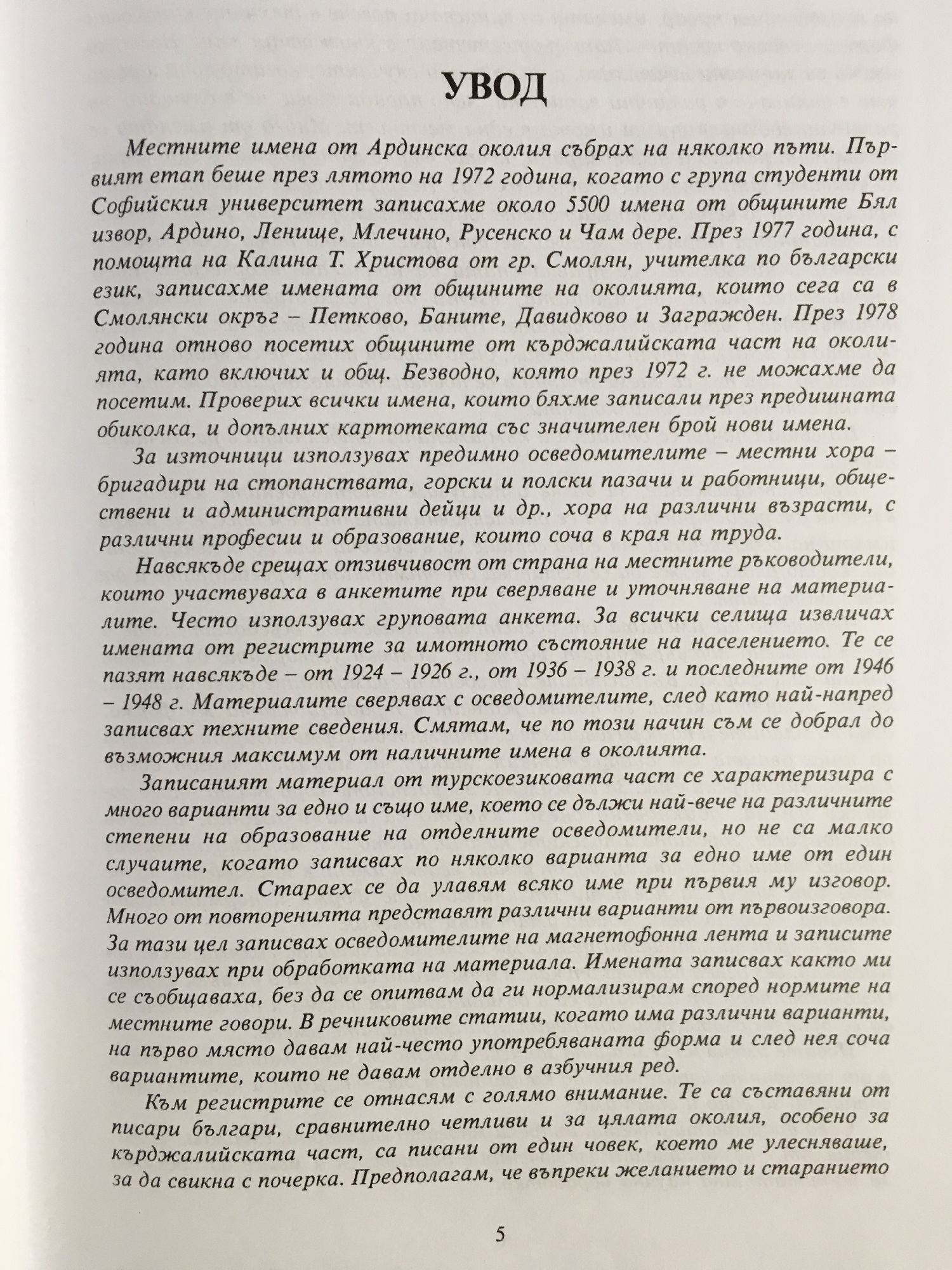 Местните имена от Ардинска околия събрах на няколко пъти. Първият етап беше през лятото на 1972 година, когато с група студенти от Софийския университет записахме около 5500 имена от общините Бял извор, Ардино, Ленище, Млечино, Русенско и Чам дере. През 1977 година, с помощта на Калина Т. Христова от гр. Смолян, учителка по български език, записахме имената от общините на околията, които сега са в Смолянски окръг - Петково, Баните, Давидково и Загражден. През 1978 година отново посетих общините от кърджалийската част на околията, като включих и общ. Безводно, която през 1972 г. не можахме да посетим. Проверих всички имена, които бяхме записали през предишната обиколка, и допълних картотеката със значителен брой нови имена. За източници използувах предимно осведомителите - местни хора -бригадири на стопанствата, горски и полски пазачи и работници, обществени и административни дейци и др., хора на различни възрасти, с различни професии и образование, които соча в края на труда. Навсякъде срещах отзивчивост от страна на местните ръководители, които участвуваха в анкетите при сверяване и уточняване на материа лите. Често използувах груповата анкета. За всички селища извличах имената от регистрите за имотното състояние на населението. Те се пазят навсякъде - от 1924 - 1926 г., от 1936 - 1938 г. и последните от 1946 - 1948 г. Материалите сверявах с осведомителите, след като най-напред записвах техните сведения. Смятам, че по този начин съм се добрал до възможния максимум от наличните имена в околията. Записаният материал от турскоезиковата част се характеризира с много варианти за едно и също име, което се дължи най-вече на различните степени на образование на отделните осведомители, но не са малко случаите, когато записвах по няколко варианта за едно име от един осведомител. Стараех се да улавям всяко име при първия му изговор. Много от повторенията представят различни варианти от първоизговора. За тази цел записвах осведомителите на магнетофонна лента и записите използувах при обработката на материала. Имената записвах както ми се съобщаваха, без да се опитвам да ги нормализирам според нормите на местните говори. В речниковите статии, когато има различни варианти, на първо място давам най-често употребяваната форма и след нея соча вариантите, които не давам отделно в азбучния ред. Към регистрите се отнасям с голямо внимание. Те са съставяни от писари българи, сравнително четливи и за цялата околия, особено за кърджалийската част, са писани от един човек, което ме улесняваше, за да свикна с почерка. Предполагам, че въпреки желанието и старанието на неизвестния писар, имената са записвани повече в техните книжовни форми, особено когато имат съответствия в книжовния език. Немалко имена са записани нечетливо, а не са редки случаите, когато едно и също име е записано в различни варианти, явно поради това, че е слушано от различни собственици на имоти в една местност. Много от имената се съобщават неясно и деформирани, което явно е затруднявало записвача, на каквито затруднения се натъквах и аз. Не бяха редки случаите, когато при групови анкети осведомителите влизаха в спорове при установяване на домашната форма на дадено местно име. Всичко това е отразено в Речника и никъде не съм правил опити да прилагам творчество. Една значителна част от имената, взети от регистрите, о
