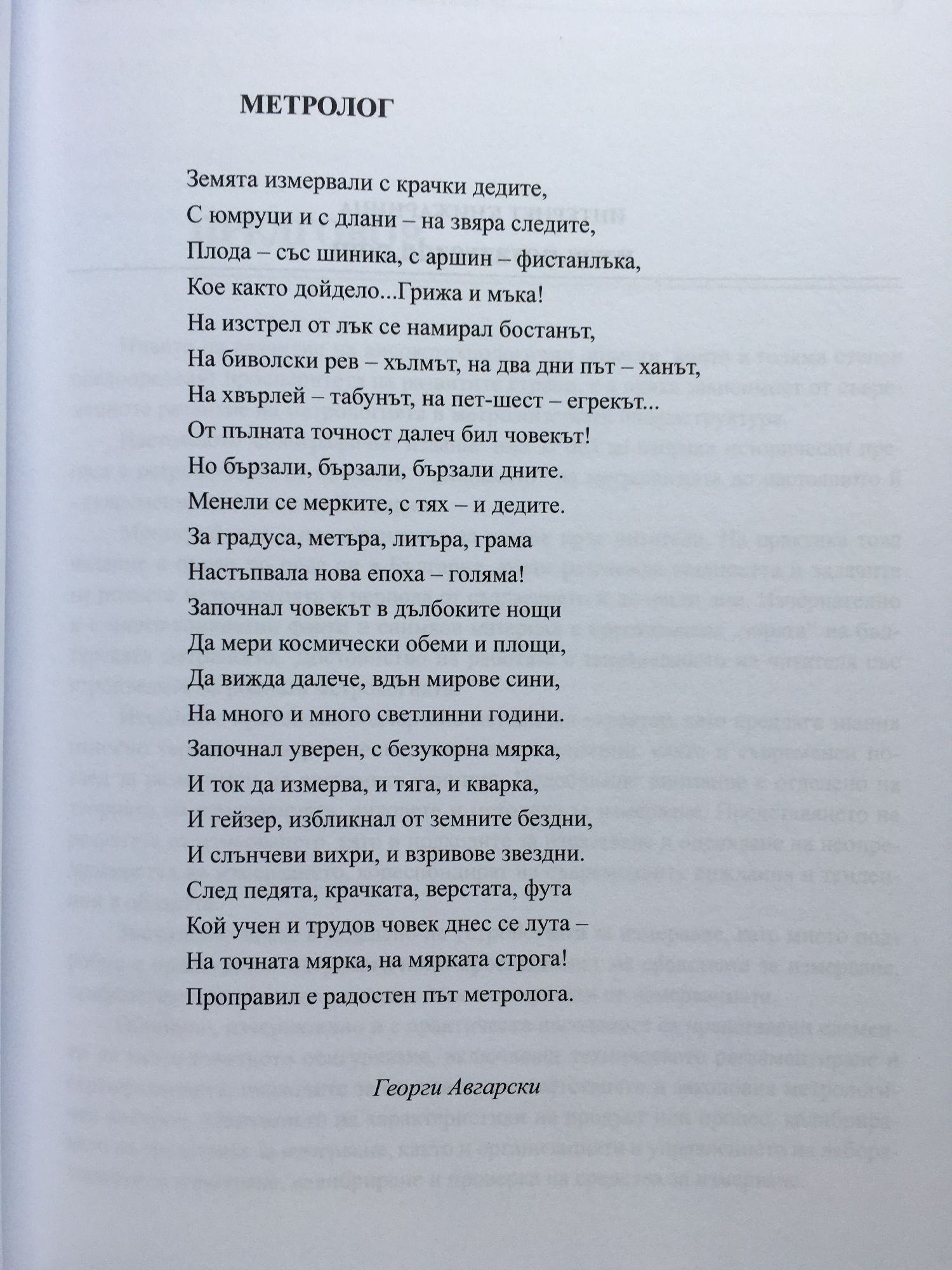 Нивото на развитие на високотехнологични области, които в голяма степен предопределят просперитета на развитите страни, е в пряка зависимост от съвременното развитие на метрологията и метрологичната инфраструктура. Настоящото монографично издание има за цел да направи исторически преглед с ретроспекция от началото - "миналото на метрологията до настоящото й - съвременно състояние в България. Монографията е предназначена за широк кръг читатели. На практика това издание е първо по рода си в България, което разглежда същността и задачите на родната метрология в периода на създаването й до наши дни. Изчерпателно и с много конкретни факти и снимков материал е пресъздадена "зората" на българската метрология. Изданието притежава подчертано методичен характер, като предлага знания относно термини и определения, величини и единици, както и съвременен поглед за развитието на системните единици. Настоящата книга е препоръчително техническо помагало за инженери, специалисти, студенти и технически персонал с интереси в областта на метрологията и измервателната техника.