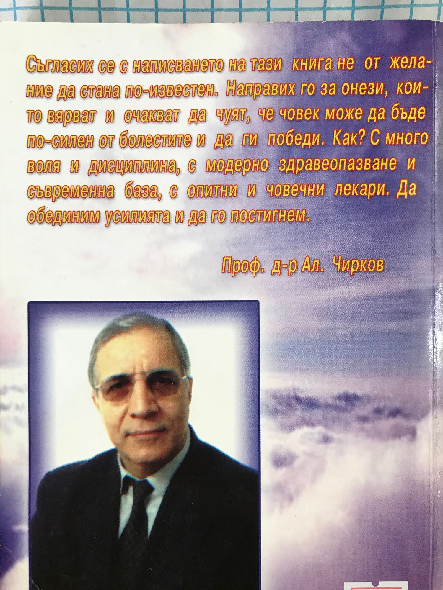 Съгласих се с написването на тази книга не от желание да стана по-известен. Направих го за онези, които вярват и очакват да чуят, че човек може да бъде по-силен от болестите и да ги победи. Как? С много воля и дисциплина, с модерно здравеопазване и съвременна база, с опитни и човечни лекари. Да обединим усилията и да го постигнем. Проф. д-р Ал. Чирков