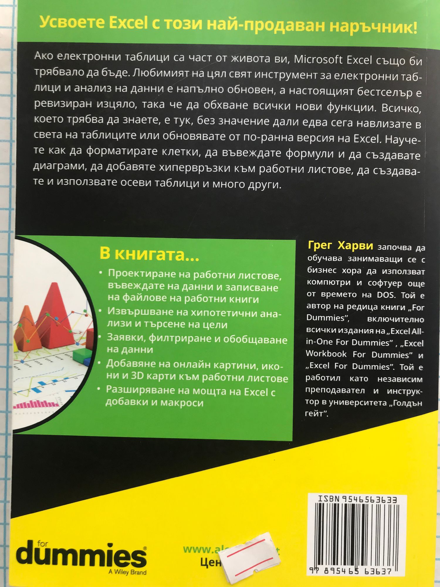 Прави ученето лесно. Усвоете "Excel" с този най-продаван наръчник! Ако електронните таблици са част от живота ви, "Microsoft Excel" също би трябвало да бъде. Любимият на цял свят инструмент за електронни таблици и анализ на данни е напълно обновен, а настоящият бестселър е ревизиран изцяло, така че да обхване всички нови функции. Всичко, което трябва да знаете, е тук, без значение дали едва сега навлизате в света на таблиците или обновявате от по-ранна версия на "Excel". Научете как да форматирате клетки, да въвеждате формули и да създавате диаграми, да добавяте хипервръзки към работни листове, да създавате и използвате осеви таблици и много други. В книгата: - проектиране на работни листове, въвеждате на данни и записване на файлове на работни книги; - извършване на хипотетични анализи и търсене на цели; - заявки, филтриране и обобщаване на данни; - добавяне на онлайн картини, икони и 3D карти към работни листове; - разширяване на мощта на Excel с добавки и макроси. Грег Харви започва да обучава занимаващи се с бизнес хора да използват компютри и софтуер още от времето на "DOS". Той е автор на редица книги "For Dummies", включително всички издания на "Excel All-in-One For Dummies" , "Excel Workbook For Dummies" и "Excel For Dummies". Той е работил като независим преподавател и инструктор в университета "Голдън гейт". От книгата ще научите: - използвайте "Excel" на всяко устройство; - показвайте вашите данни, като използвате всички нови функции на "Excel"; - контролирайте данните и следете и подреждайте вашата информация.