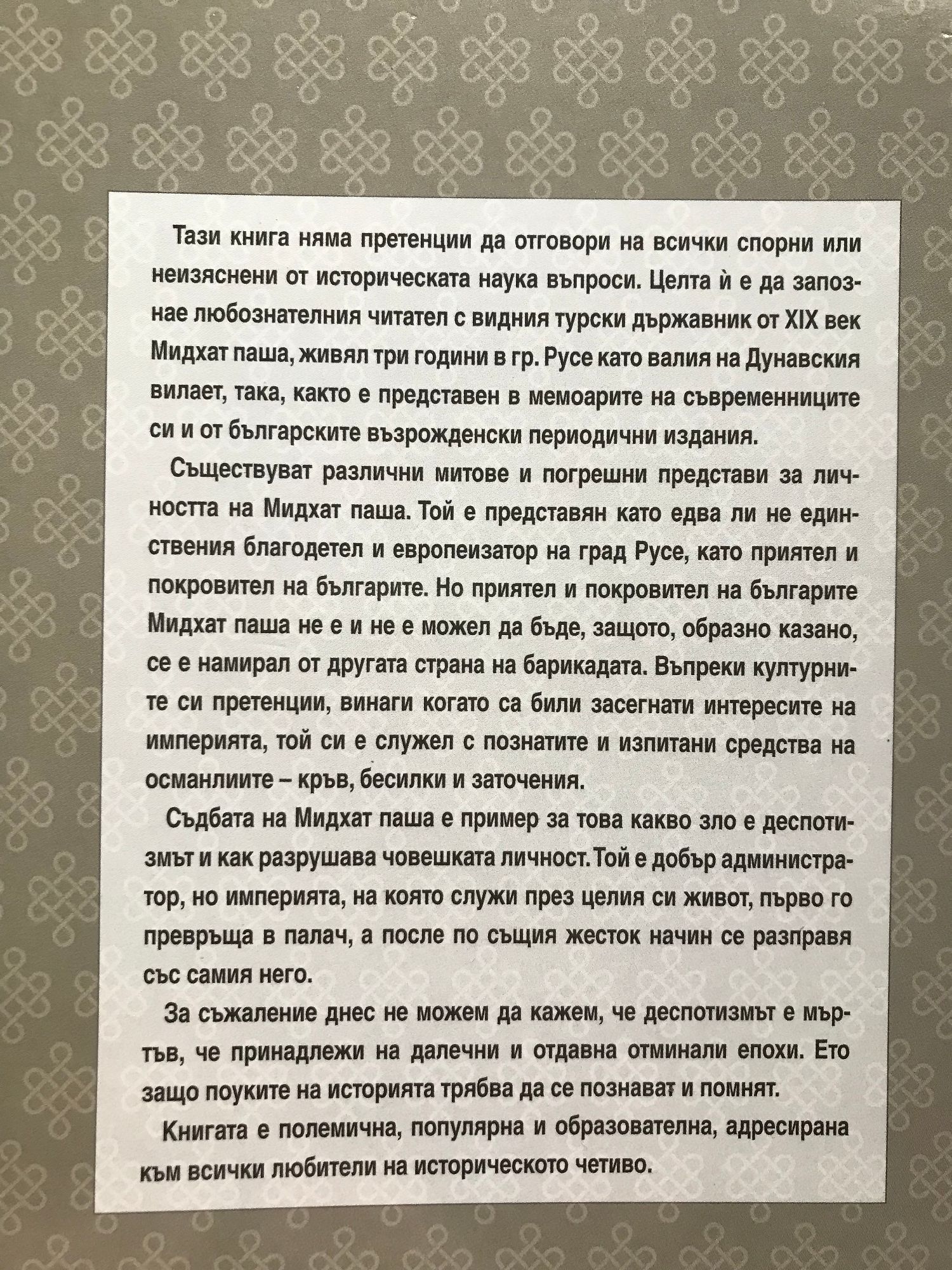 Тази книга няма претенции да отговори на всички спорни или неизяснени от историческата наука въпроси. Целта й е да запознае любознателния читател с видния турски държавник от XIX век Мидхат паша, живял три години в Русе като валия на Дунавския вилает, така, както е представен в мемоарите на съвременниците си и от българските възрожденски периодични издания. Съществуват различни митове и погрешни представи за личността на Мидхат паша. Той е представян като едва ли не единствения благодетел и европеизатор на град Русе, като приятел и покровител на българите. Но приятел и покровител на българите Мидхат паша не е и не е можел да бъде, защото образно казано, се е намирал от другата страна на барикадата. Въпреки културните си претенции, винаги когато са били засегнати интересите на империята, той си е служел с познатите и изпитани средства на османлиите - кръв, бесилки и заточения. Съдбата на Мидхат паша е пример за това какво зло е деспотизмът и как разрушава човешката личност. Той е добър администратор, но империята, на която служи през целия си живот, първо го превръща в палач, а после по същия жесток начин се разправя със самия него. За съжаление днес не можем да кажем, че деспотизмът е мъртъв, че принадлежи на далечни и отдавна отминали епохи. Ето защо поуките на историята трябва да е познават и помнят. Книгата е полемична, популярна и образователна, адресирана към всички любители на историческото четиво.