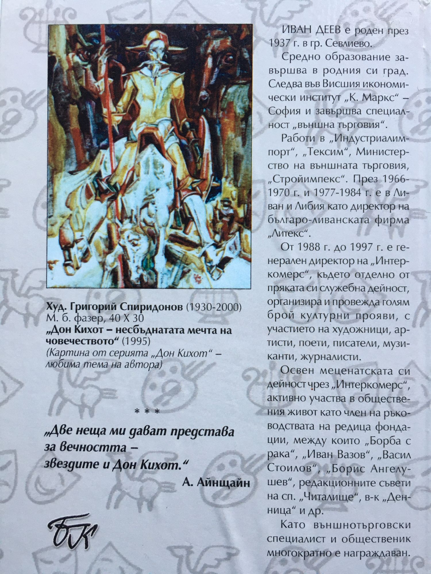 ИВАН ДЕЕВ е роден през 1937 г. в гр. Севлиево. Средно образование завършва в родния си град. Следва във Висшия икономически институт „К. Маркс“, София, и завършва специалност „външна търговия“. Работи в „Индустриал-импорт“, „Тексим“, Министерство на външната търговия, „Стройимпекс“. През 1966-1970 г. и 1977-1984 г. е в Ливан и Либия като директор на българо-ливанската фирма „Литекс“. От 1988 г. до 1997 г. е генерален директор на „Интеркомерс“, където отделно от пряката си служебна дейност, организира и провежда голям брой културни прояви, с участието на художници, артисти, поети, писатели, музиканти, журналисти. Освен меценатската си дейност чрез „Интеркомерс“, активно участва в обществения живот като член на ръководствата на редица фондации, между които „Борба с рака“, „Иван Вазов“, „Васил Стоилов“, „Борис Ангелушев“, редакционните съвети на сп. „Читалище“, в-к „Денница“ и др. Като външнотърговски специалист и общественик многократно е награждаван.