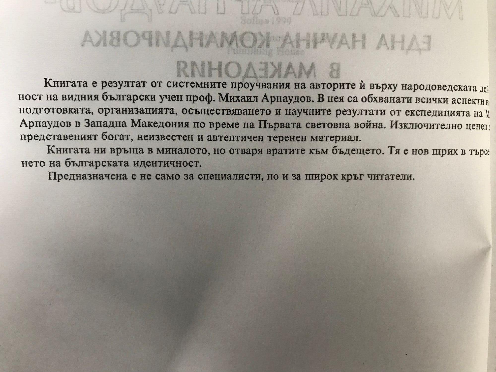 Книгата е резултат от системните проучвания на авторите й върху народоведската дейност на видния български учен проф. Михаил Арнаудов. В нея са обхванати всички аспекти на подготовката, организацията и научните резултати от експедицията на М. Арнаудов в Западна Македония по време на Първата световна война. Изключително ценен е представеният богат, неизвестен и автентичен теренен материал.