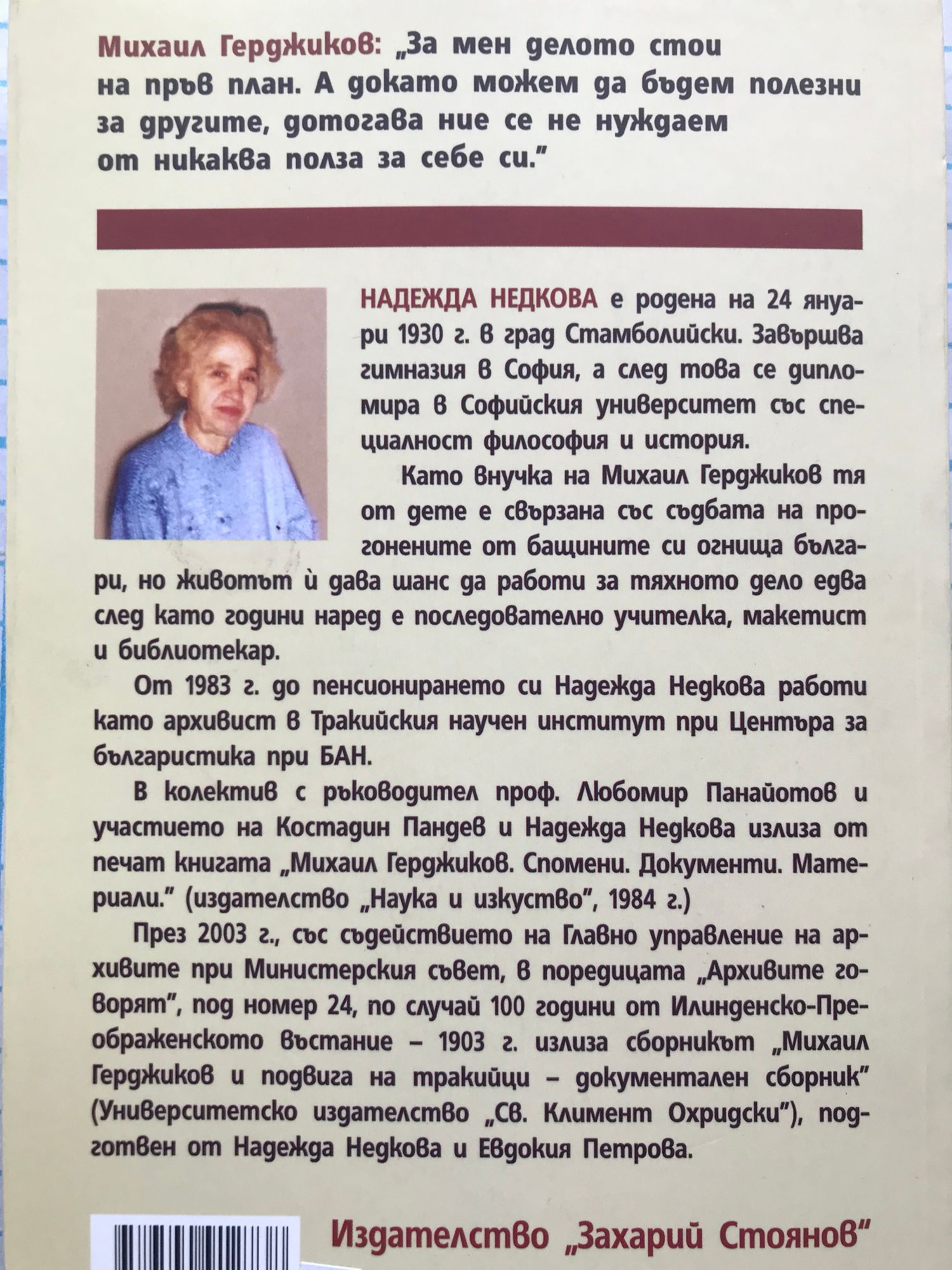 Герджиков е роден в 1877 година в Пловдив като първо дете в семейството на Иван Павлов Герджиков, родом от Копривщица, завършил Болградската гимназия и участвал в създаването на нова администрация в Пловдив след Руско-турската война и батачанката Магдалина Илич. Детството си прекарва в Пловдив, където се запалва по идеите на анархизма. Силно влияние затова му оказва д-р Русел Судзиловски, личен приятел на Христо Ботев, който известно време пребивавал в родната му къща. Като ученик под влияние на левичарски идеи създава през 1895 г. анархистка група в Пловдивската гимназия, заради което е изключен. В края на същата година той се свързва с македонски гимназисти в града и заедно с други свои съученици по подражание на революционерите от предосвобожденската епоха основават Централен революционен македонски комитет със силно анархистична насоченост. Надежда Недкова е родена на 24 януари 1930 г. в град Стамболийски. Завършва гимназия в София, а след това се дипломира в Софийския университет със специалност "философия и история". Като внучка на Михаил Герджиков тя от дете е свързана със съдбата на прогонените от бащините си огнища българи, но животът ѝ дава шанс да работи за тяхното дело едва след като години наред е последователно учителка, макетист и библиотекар. От 1983 г. до пенсионирането си Надежда Недкова работи като архивист в Тракийския научен институт при "Центъра за българистика" при БАН. В колектив с ръководител проф. Любомир Панайотов и участието на Костадин Пандев и Надежда Недкова излиза от печат книгата "Михаил Герджиков. Спомени. Документи. Материали.". През 2003 г., със съдействието на "Главно управление на архивите" при Министерския съвет, в поредицата "Архивите говорят" излиза сборникът "Михаил Герджиков и подвига на тракийци - документален сборник", подготвен от Надежда Недкова и Евдокия Петрова.