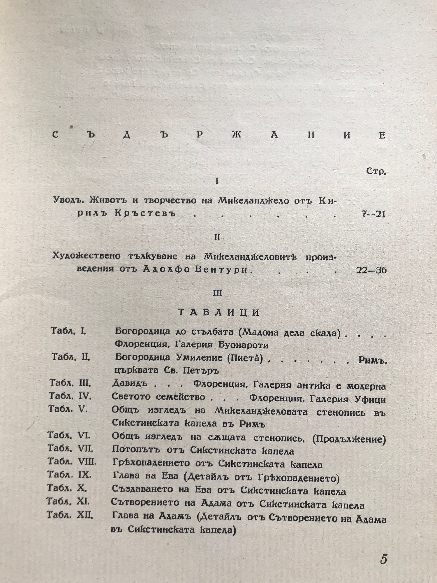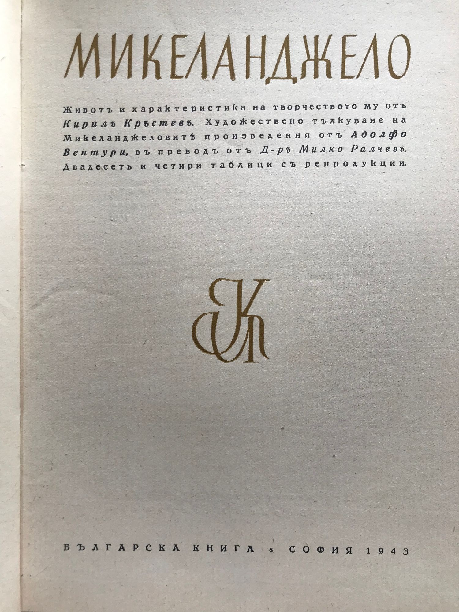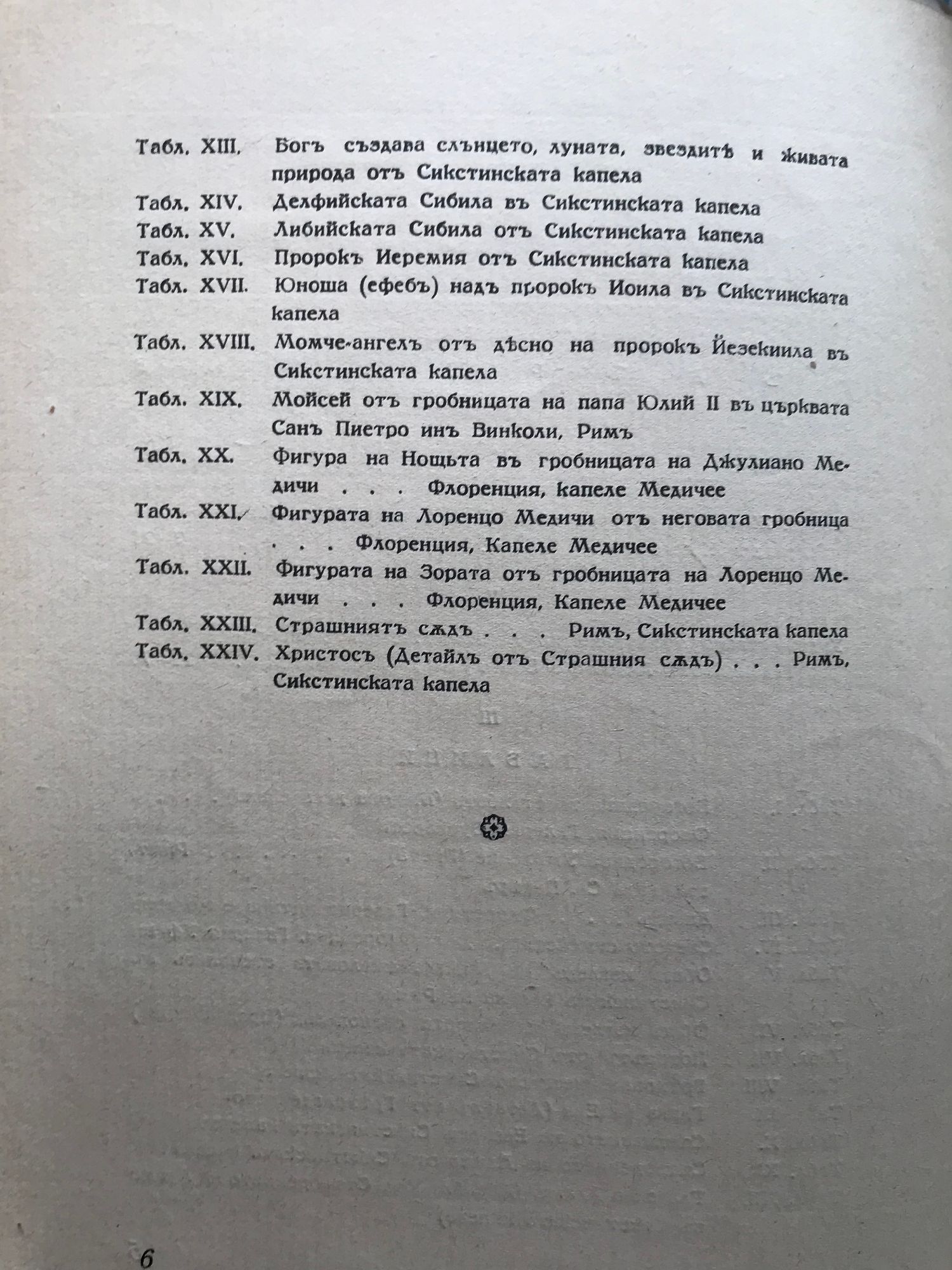 Животъ и характеристика на творчеството му отъ Кирилъ Кръстевъ. Художествено тълкуване на Микеланджеловите произведения отъ Адолфо Вентури, въ преводъ от Милко Ралчевъ. Двадесеть и четири таблици съ репродукции