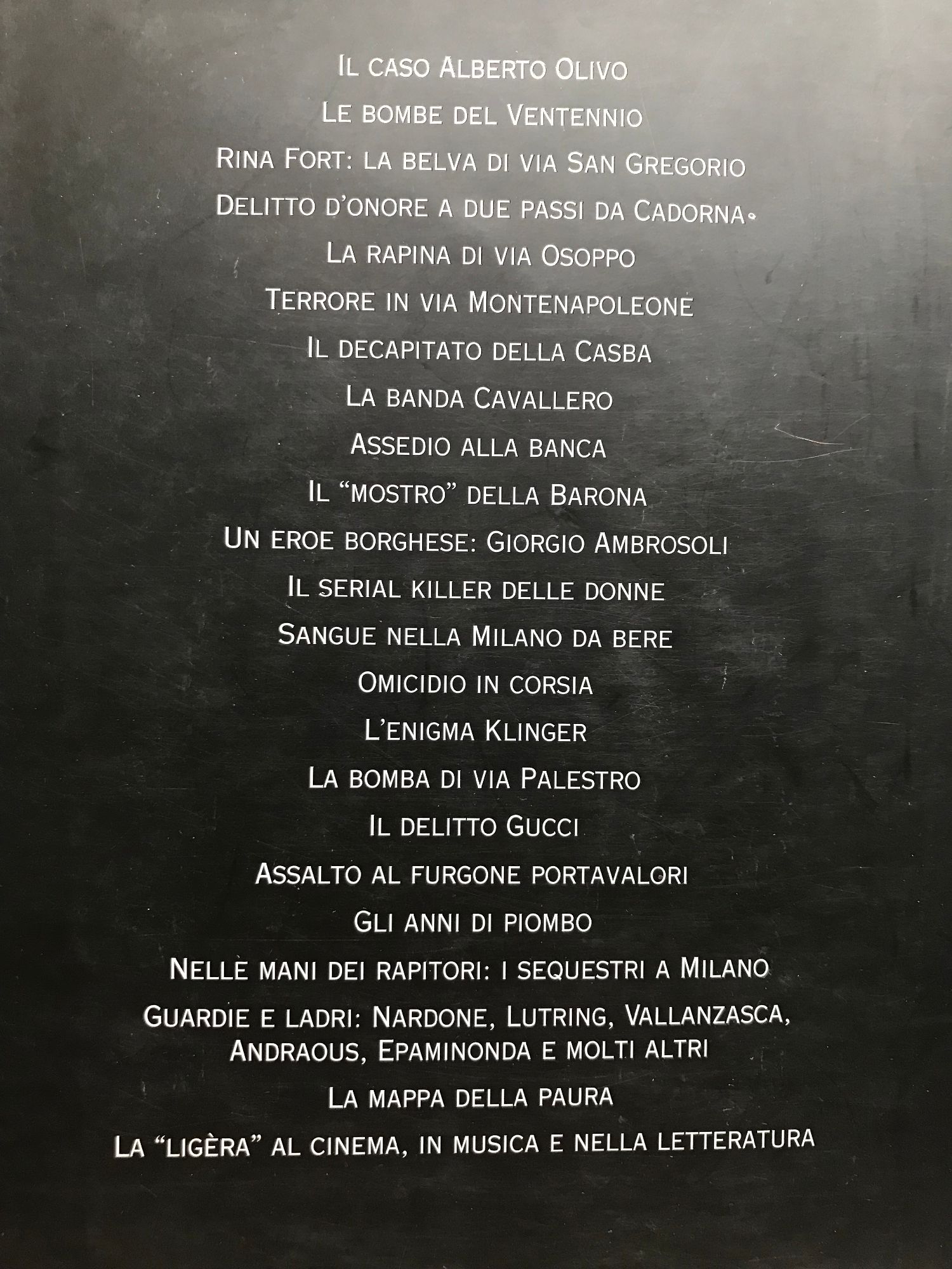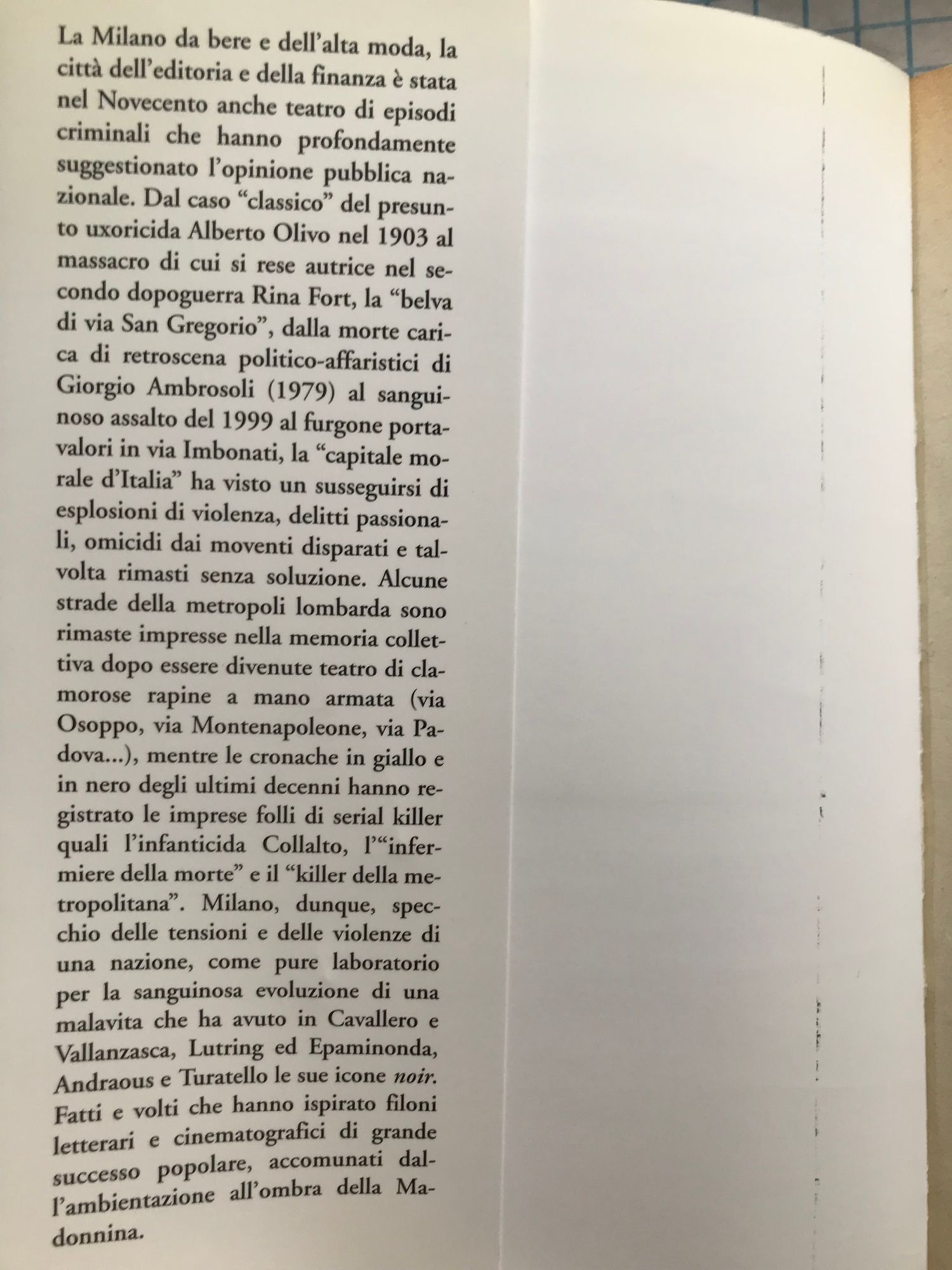 Dal caso "classico" del presunto uxoricida Alberto Olivo nel al massacro di cui si rese autrice nel secondo dopoguerra Rina Fort, la "belva di via San Gregorio", dalla morte carica di retroscena politico-affaristici di Giorgio Ambrosoli al sanguinoso assalto al furgone portavalori in via Imbonati