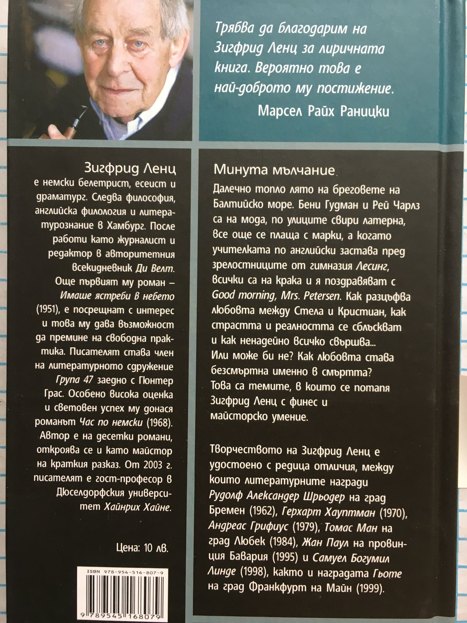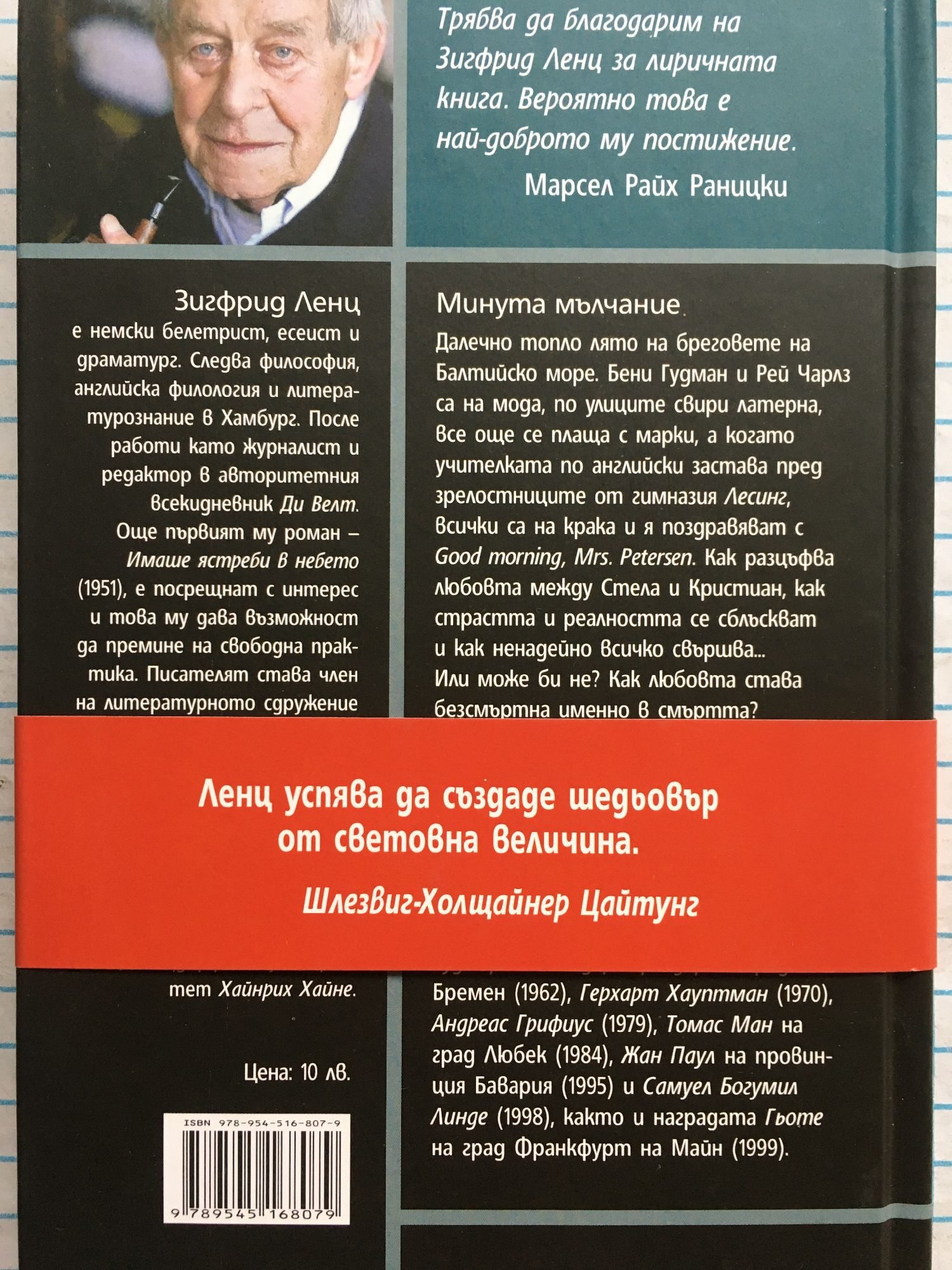 Рядко сме чели нещо толкова непорочно и толкова еротично. Едно истинско бижу във и извън времето. - Ди Цайт Далечно топло лято на бреговете на Балтийско море. Бени Гудман и Рей Чарлз са на мода, по улиците свири латерна, все още се плаща с марки, а когато учителката по английски застава пред зрелостниците от гимназия Лесинг, всички са на крака и я поздравяват с Good morning, Mrs. Petersen. Как разцъфва любовта между Стела и Кристиан, как страстта и реалността се сблъскват и как ненадейно всичко свършва... Или може би не? Как любовта става безсмъртна именно в смъртта? Това са темите, в които се потапя Зигфрид Ленц с финес и майсторско умение. Творчеството на Зигфрид Ленц е удостоено с редица отличия, между които литературните награди Рудолф Александер Шрьодер на град Бремен (1962), Герхарт Хауптман (1970), Андреас Грифиус (1979), Томас Ман на град Любек (1984), Жан Паул на провинция Бавария (1995) и Самуел Богумил Линде (1998), както и наградата Гьоте на град Франкфурт на Майн (1999). Зигфрид Ленц е немски белетрист, есеист и драматург. Следва философия, английска филология и литературознание в Хамбург. После работи като журналист и редактор в авторитетния всекидневник Ди Велт. Още първият му роман – Имаше ястреби в небето (1951), е посрещнат с интерес и това му дава възможност да премине на свободна практика. Писателят става член на литературното сдружение Група 47 заедно с Гюнтер Грас. Особено висока оценка и световен успех му донася романът Час по немски (1968). Автор е на десетки романи, откроява се и като майстор на краткия разказ. От 2003 г. писателят е гост-професор в Дюселдорфския университет Хайнрих Хайне.