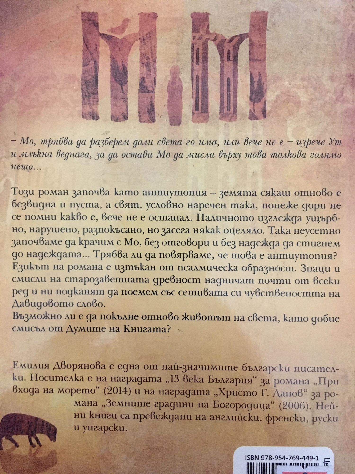 - Мо, трябва да разберем дали света го има, или вече не е - изрече Ут и млъкна веднага, за да остави Мо да мисли върху това толкова голямо нещо… Този роман започва като антиутопия – земята сякаш отново е безвидна и пуста, а свят, условно наречен така, понеже дори не се помни какво е, вече не е останал. Наличното изглежда ущърбно, нарушено, разпокъсано, но засега някак оцеляло. Така неусетно започваме да крачим с Мо, без отговори и без надежда да стигнем до надеждата... Трябва ли да повярваме, че това е антиутопия? Езикът на романа е изтъкан от псалмическа образност. Знаци и смисли на старозаветната древност надничат почти от всеки ред и ни подканят да поемем със сетивата си чувствеността на Давидовото слово. Възможно ли е да покълне отново животът на света, като добие смисъл от Думите на Книгата?