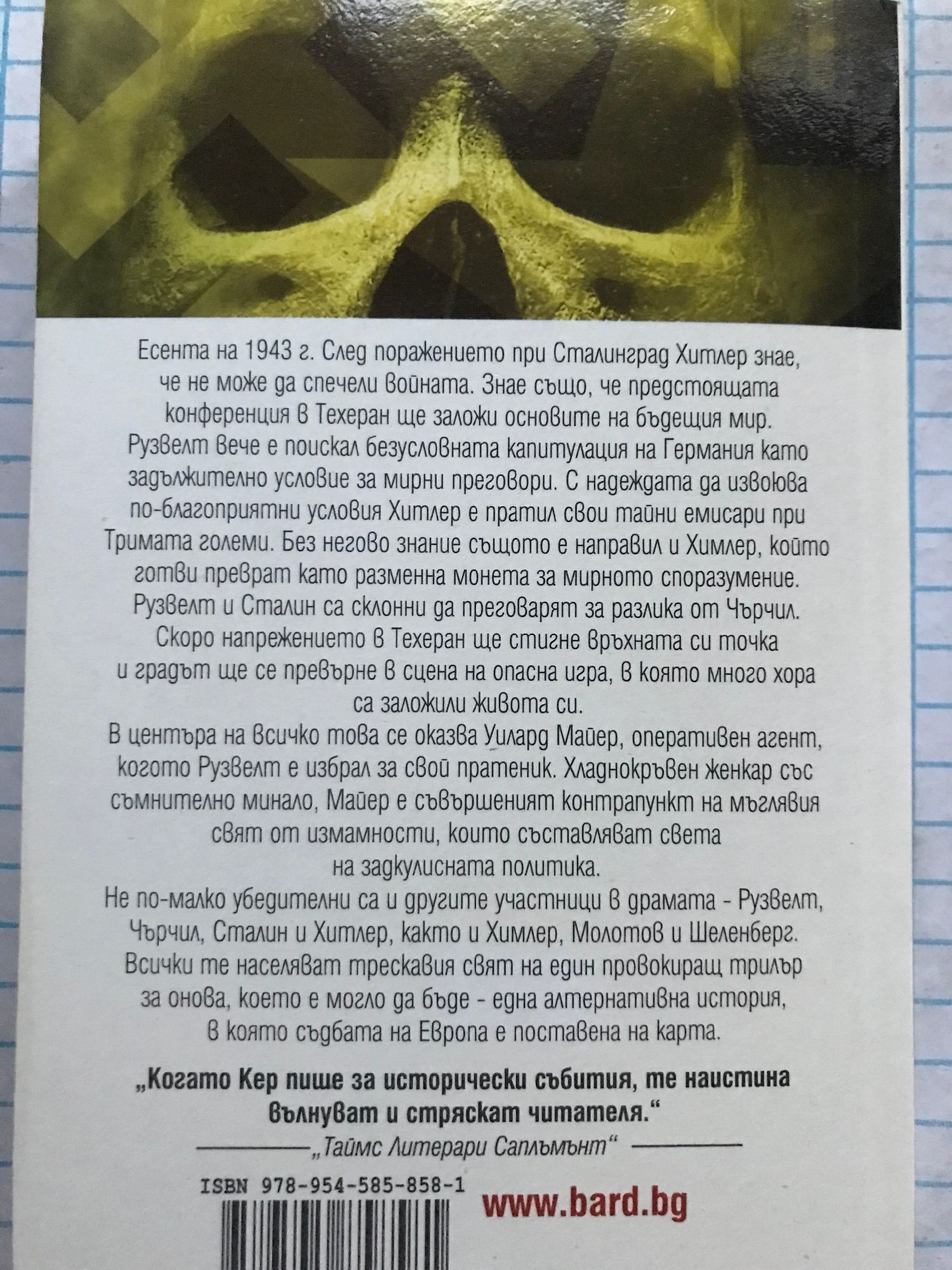Трескавият свят на задкулисната политика! Есента на 1943 г. След поражението при Сталинград Хитлер знае, че не може да спечели войната. Знае също, че предстоящата конференция в Техеран ще заложи основите на бъдещия мир. Рузвелт вече е поискал безусловната капитулация на Германия като задължително условие за мирни преговори. С надеждата да извоюва по-благоприятни условия Хитлер е пратил свои тайни емисари при Тримата големи. Без негово знание същото е направил и Химлер, който готви преврат като разменна монета за мирното споразумение. Рузвелт и Сталин са склонни да преговарят за разлика от Чърчил. Скоро напрежението в Техеран ще стигне връхната си точка и градът ще се превърне в сцена на опасна игра, в която много хора са заложили живота си. В центъра на всичко това се оказва Уилард Майер, оперативен агент, когото Рузвелт е избрал за свой пратеник. Хладнокръвен женкар със съмнително минало, Майер е съвършеният контрапункт на мъглявия свят от измамности, които съставляват света на задкулисната политика. Не по-малко убедителни са и другите участници в драмата – Рузвелт, Чърчил, Сталин и Хитлер, както и Химлер, Молотов и Шеленберг. Всички те населяват трескавия свят на един провокиращ трилър за онова, което е могло да бъде – една алтернативна история, в която съдбата на Европа е поставена на карта. „Когато Кер пише за исторически събития, те наистина вълнуват и стряскат читателя.” (Таймс Литерари Саплъмънт)