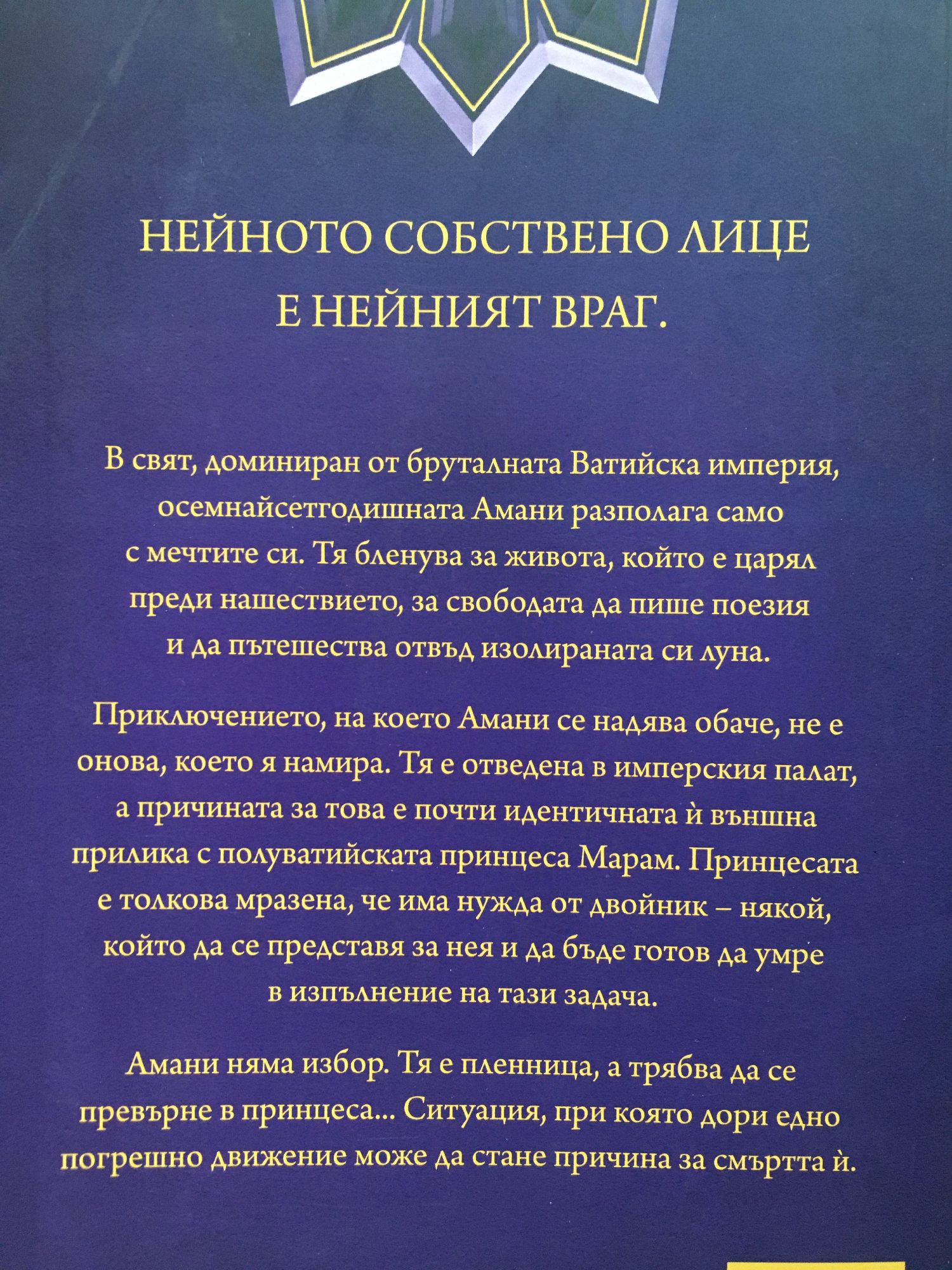НЕЙНОТО СОБСТВЕНО ЛИЦЕ Е НЕЙНИЯТ ВРАГ. В свят, доминиран от бруталната Ватийска империя, осемнайсетгодишната Амани разполага само с мечтите си. Тя бленува за живота, който е царял преди нашествието, за свободата да пише поезия и да пътешества отвъд изолираната си луна. Приключението, на което Амани се надява обаче, не е онова, което я намира. Тя е отведена в имперския палат, а причината за това е почти идентичната ? външна прилика с полуватийската принцеса Марам. Принцесата е толкова мразена, че има нужда от двойник – някой, който да се представя за нея и да бъде готов да умре в изпълнение на тази задача. Амани няма избор. Тя е пленница, а трябва да се превърне в принцеса... Ситуация, при която дори едно погрешно движение може да стане причина за смъртта ?.
