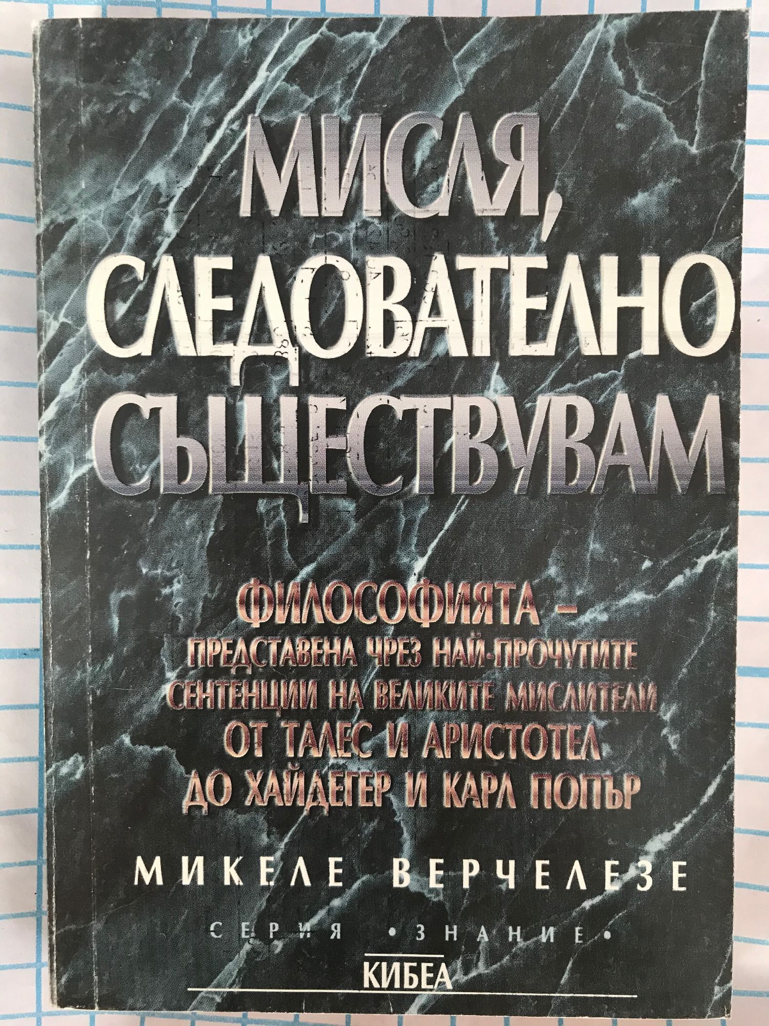 "Мисля, следователно съществувам" от Микеле Верчелезе е малък сборник с най-прочутите философски сентенции, придружени от коментар на значението им и въведение в някои от най-същностните проблеми, вълнували философите. Книгата е своеобразен кратък курс по история на философията, популярно въведение в тази дисциплина, забавен наръчник, предлагащ достъп до най-сериозни и сложни философски концепции.