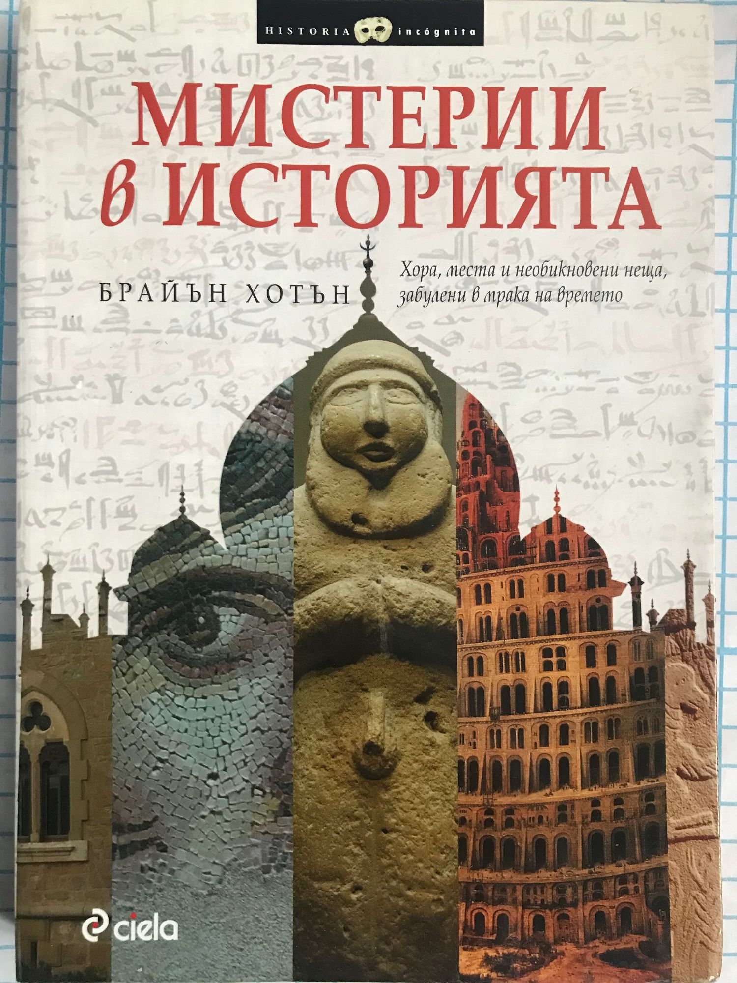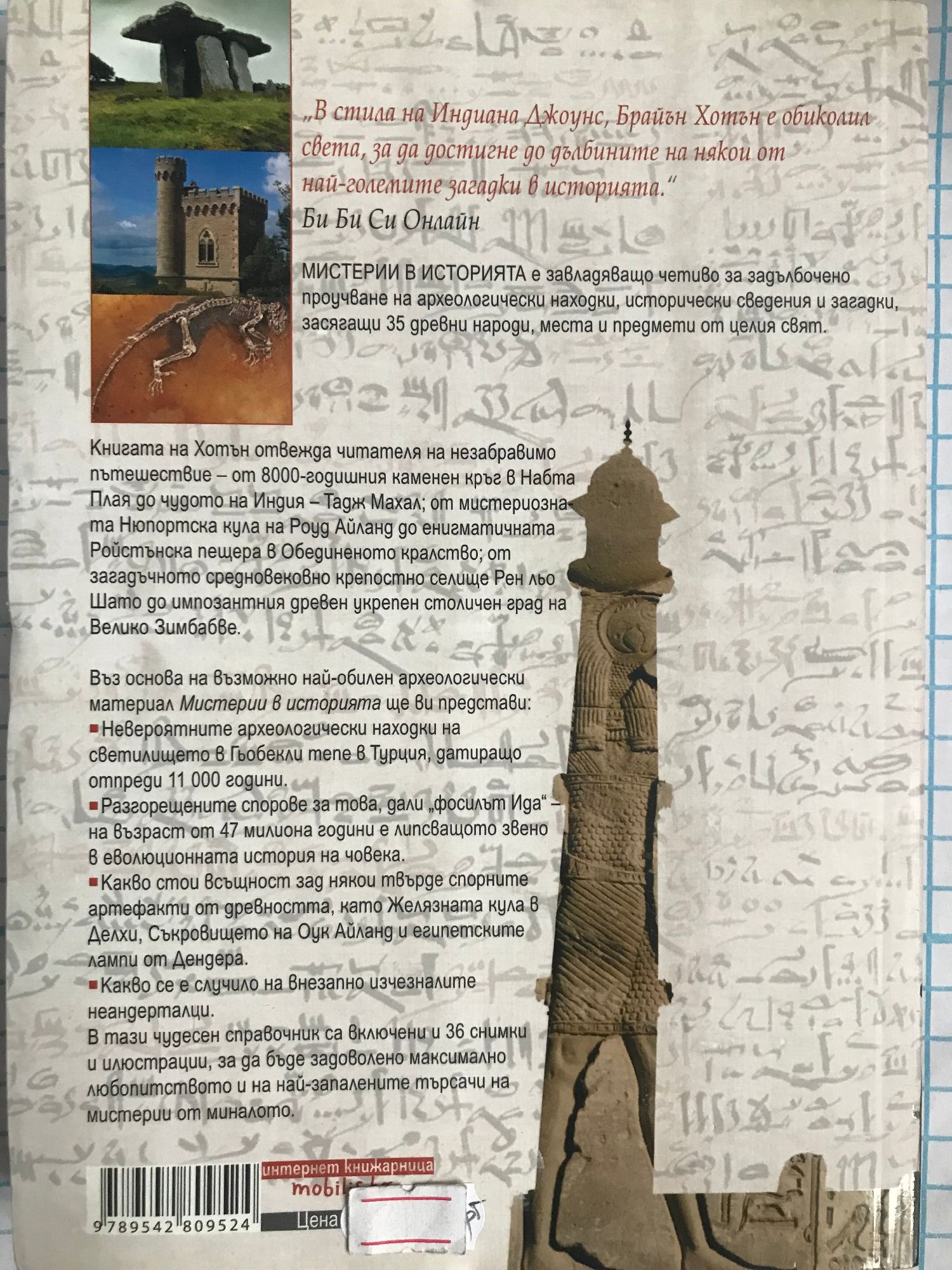 „В стила на Индиана Джоунс, Брайън Хотън е обиколил света, за да достигне до дълбините на някои от най-големите загадки в историята.” Би Би Си Онлайн „Мистерии в историята” е завладяващо четиво за задълбочено проучване на археологически находки, исторически сведения и загадки, засягащи 35 древни народи, места и предмети от целия свят. Книгата на Хотън отвежда читателя на незабравимо пътешествие – от 8000-годишния каменен кръг в Набта Плая до чудото на Индия – Тадж Махал; от мистериозната Нюпортска кула на Роуд Айланд до енигматичната Ройстънска пещера в Обединеното кралство; от загадъчното средновековно крепостно селище Рен льо Шато до импозантния древен укрепен столичен град на Велико Зимбабве. Въз основа на възможно най-обилен археологически материал „Мистерии в историята” ще ви представи: * Невероятните археологически находки на светилището в Гьобекли тепе в Турция, датиращо отпреди 11 000 години * Разгорещените спорове за това, дали „фосилът Ида” – на възраст от 47 милиона години – е липсващото звено в еволюционната история на човека * Какво стои всъщност зад някои твърде спорните артефакти от древността, като Желязната кула в Делхи, Съкровището на Оук Айланд и египетските лампи от Дендера * Какво се е случило на внезапно изчезналите неандерталци? В тази чудесен справочник са включени и 36 снимки и илюстрации, за да бъде задоволено максимално любопитството и на най-запалените търсачи на мистерии от миналото. Брайън Хотън изследва праисторическите мегалитни обекти, древните светилища и свръхестествените елементи във фолклора и пише за тях. Първата му книга „Скритата история: Изчезнали цивилизации, тайно знание и древни мистерии” е преведена на 11 езика (включително и на български). Брайън много отдавна е пленен от древния свят с неговите приказки за свръхестествени неща, а първата искра на тази любов пламва при посещението му на неолитните камерни гробници в Котсуолд Хилс в Англия. Сега живее в Гърция.