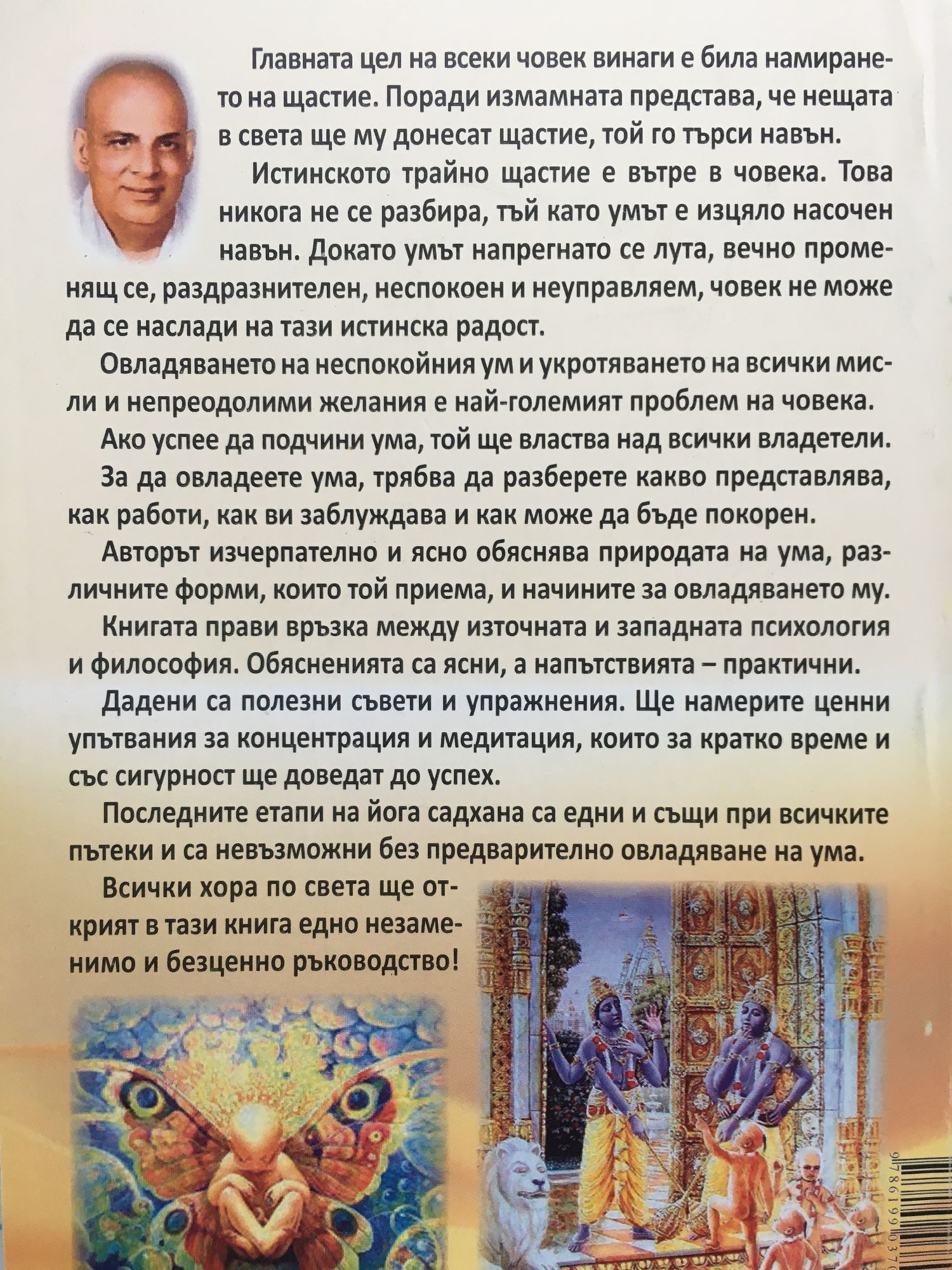 Главната цел на всеки човек винаги е била намирането на щастие. Поради измамната представа, че нещата в света ще му донесат щастие, той го търси навън. Истинското трайно щастие е вътре в човека. Това никога не се разбира, тъй като умът е изцяло насочен навън. Докато умът напрегнато се лута, вечно променящ се, раздразнителен, неспокоен и неуправляем, човек не може да се наслади на тази истинска радост. Овладяването на неспокойния ум и укротяването на всички мисли и непреодолими желания е най-големият проблем на човека. Ако успее да подчини ума, той ще властва над всички владетели. За да овладеете ума, трябва да разберете какво представлява, как работи, как ви заблуждава и как може да бъде покорен. Авторът изчерпателно и ясно обяснява природата на ума, различните форми, които той приема, и начините за овладяването му. Книгата прави връзка между източната и западната психология и философия. Обясненията са ясни, а напътствията - практични. Дадени са полезни съвети и упражнения. Ще намерите ценни упътвания за концентрация и медитация, които за кратко време и със сигурност ще доведат до успех. Последните етапи на йога садхана са едни и същи при всичките пътеки и са невъзможни без предварително овладяване на ума. Всички хора по света ще открият в тази книга едно незаменимо и безценно ръководство!