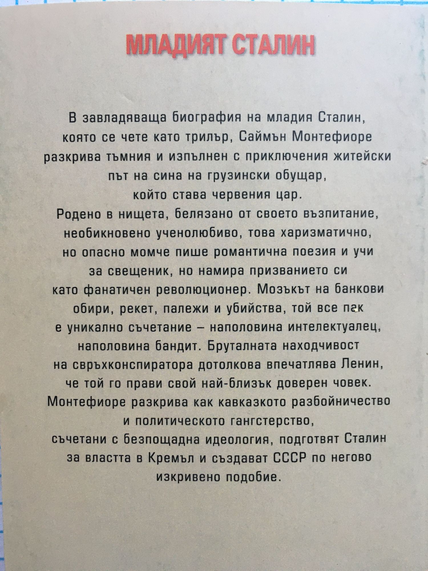 В завладяваща биография на младия Сталин, която се чете като трилър, Саймън Монтефиоре разкрива тъмния и изпълнен с приключения житейски път на сина на грузински обущар, който става червения цар. Родено в нищета, белязано от своето възпитание, необикновено ученолюбиво, това харизматично, но опасно момче пише романтична поезия и учи за свещеник, но намира призванието си като фанатичен революционер. Мозъкът на банкови обири, рекет, палежи и убийства, той все пак е уникално съчетание – наполовина интелектуалец, наполовина бандит. Бруталната находчивост на свръхконспиратора дотолкова впечатлява Ленин, че той го прави свой най-близък доверен човек. Монтефиоре разкрива как кавказкото разбойничество и политическото гангстерство, съчетани с безпощадна идеология, подготвят Сталин за властта в Кремъл и създават СССР по негово изкривено подобие.