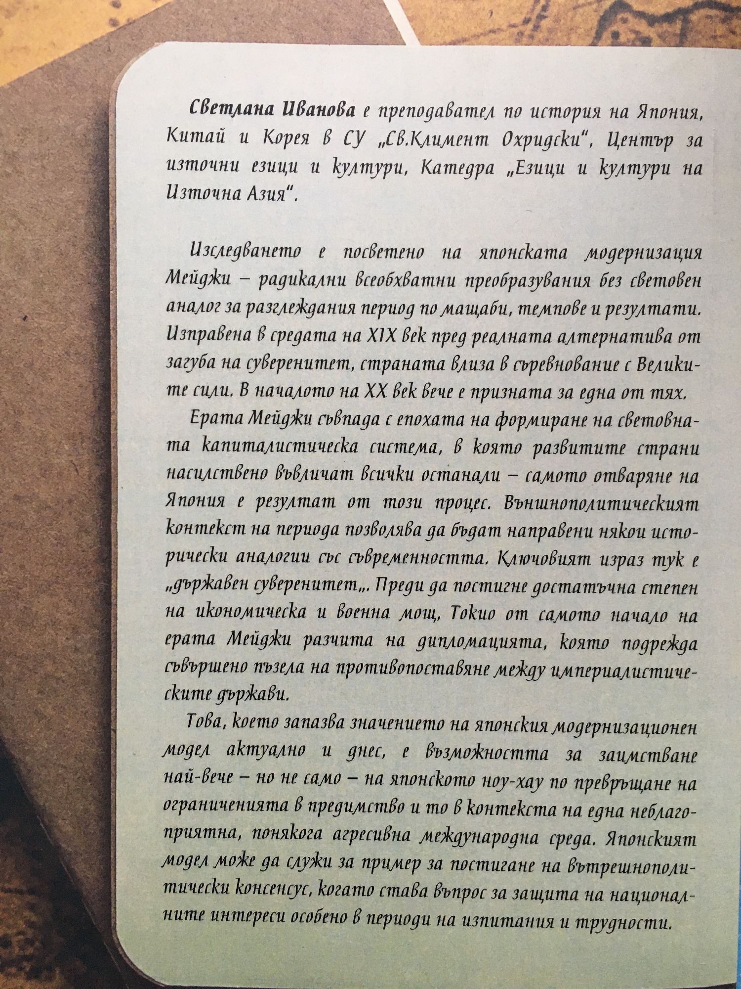 Изследването е посветено на японската модернизация Мейджи – радикални всеобхватни преобразувания без световен аналог за разглеждания период по мащаби, темпове и резултати. Изправена в средата на XIX век пред реалната алтернатива от загуба на суверенитет, страната влиза в съревнование с Великите сили. В началото на XX век вече е призната за една от тях. Ерата Мейджи съвпада с епохата на формиране на световната капиталистическа система, в която развитите страни насилствено въвличат всички останали – самото отваряне на Япония е резултат от този процес. Външнополитическият контекст на периода позволява да бъдат направени някои исторически аналогии със съвременността. Ключовият израз тук е „държавен суверенитет“. Преди да постигне достатъчна степен на икономическа и военна мощ, Токио от самото начало на ерата Мейджи разчита на дипломацията, която подрежда съвършено пъзела на противопоставяне между империалистическите държави. Това, което запазва значението на японския модернизационен модел актуално и днес, е възможността за заимстване най-вече – но не само – на японското ноу-хау по превръщане на ограниченията в предимство и то в контекста на една неблагоприятна, понякога агресивна международна среда. Японският модел може да служи за пример за постигане на вътрешнополитически консенсус, когато става въпрос за защита на националните интереси особено в периоди на изпитания и трудности.