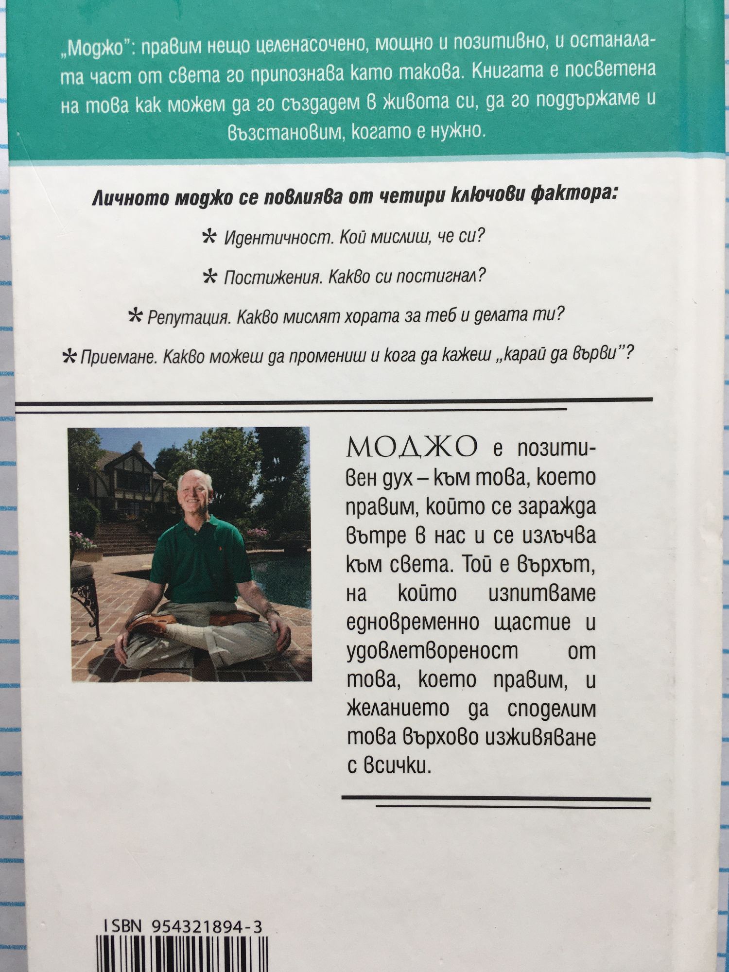 „Моджо”: правим нещо целенасочено, мощно и позитивно, и останалата част от света го припознава като такова. Книгата е посветена на това как можем да го създадем в живота си, да го поддържаме и възстановим, когато е нужно. Личното моджо се повлиява от четири ключови фактора: * Идентичност. Кой мислиш, че си? * Постижения. Какво си постигнал? * Репутация. Какво мислят хората за теб и делата ти? * Приемане. Какво можеш да промениш и кога да кажеш „карай да върви”? Моджо е позитивен дух – към това, което правим, който се заражда вътре в нас и се излъчва към света. Той е върхът, на който изпитваме едновременно щастие и удовлетвореност от това, което правим, и желанието да споделим това върхово изживяване с всички.