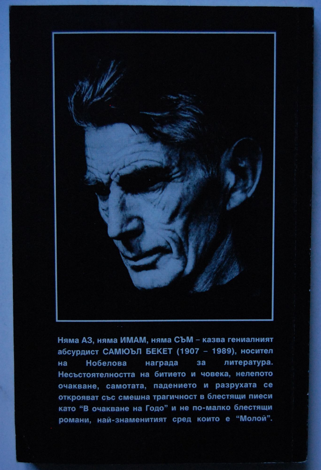 Няма A3, няма ИМАМ, няма СЪМ - казва гениалният абсурдист САМЮЪЛ БЕКЕТ (1907 - 1989), носител на Нобелова награда за литература. Несъстоятелността на битието и човека, нелепото очакване, самотата, падението и разрухата се открояват със смешна трагичност в блестящи пиеси като "В очакване на Годо" и не по-малко блестящи романи, най-знаменитият сред които е "Молой".