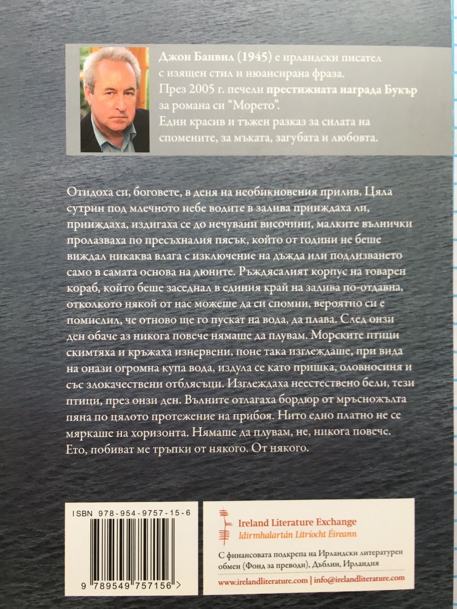 Джон Банвил (1945) е ирландски писател с изящен стил и нюансирана фраза. През 2005 г. печели престижната награда Букър за романа си "Морето". Един красив и тъжен разказ за силата на спомените, за мъката, загубата и любовта. Отидоха си, боговете, в деня на необикновения прилив. Цяла сутрин под млечното небе водите в залива прииждаха ли, прииждаха, издигаха се до нечувани височини, малките вълнички пролазваха по пресъхналия пясък, който от години не беше виждал никаква влага с изключение на дъжда или подлизването само в самата основа на дюните. Ръждясалият корпус на товарен кораб, който беше заседнал в единия край на залива по-отдавна, отколкото някой от нас можеше да си спомни, вероятно си е помислил, че отново ще го пускат на вода, да плава. След онзи ден обаче аз никога повече нямаше да плувам. Морските птици скимтяха и кръжаха изнервени, поне така изглеждаше, при вида на онази огромна купа вода, издула се като пришка, оловносиня и със злокачествени отблясъци. Изглеждаха неестествено бели, тези птици, през онзи ден. Вълните отлагаха бордюр от мръсножълта пяна по цялото протежение на прибоя. Нито едно платно не се мяркаше на хоризонта. Нямаше да плувам, не, никога повече. Ето, побиват ме тръпки от някого. От някого.