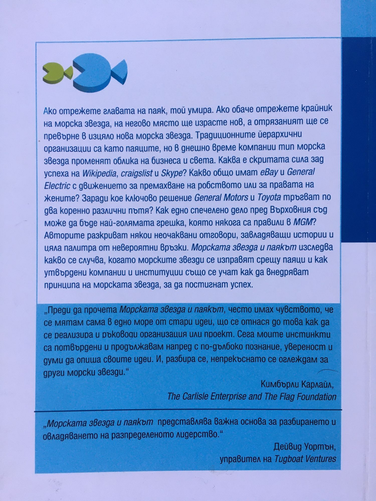 Ако отрежете главата на паяк, той умира. Ако обаче отрежете крайник на морска звезда, на негово място ще израсте нов, а отрязаният ще се превърне в изцяло нова морска звезда. Традиционните йерархични организации са като паяците, но в днешно време компании тип морска звезда променят облика на бизнеса и света. Каква е скритата сила зад успеха на Wikipedia, craigslist и Skype? Какво общо имат eBay и General Electric с движението за премахване на робството или за правата на жените? Заради кое ключово решение General Motors и Toyota тръгват по два коренно различни пътя? Как едно спечелено дело пред Върховния съд може да бъде най-голямата грешка, която някога са правили в MGM? Авторите разкриват някои неочаквани отговори, завладяващи истории и цяла палитра от невероятни връзки. Морската звезда и паякът изследва какво се случва, когато морските звезди се изправят срещу паяци и как утвърдени компании и институции също се учат как да внедряват принципа на морската звезда, за да постигнат успех. „Преди да прочета Морската звезда и паякът, често имах чувството, че се мятам сама в едно море от стари идеи, що се отнася до това как да се реализира и ръководи организация или проект. Сега моите инстинкти са потвърдени и продължавам напред с по-дълбоко познание, увереност и думи да опиша своите идеи. И, разбира се, непрекъснато се оглеждам за други морски звезди.“