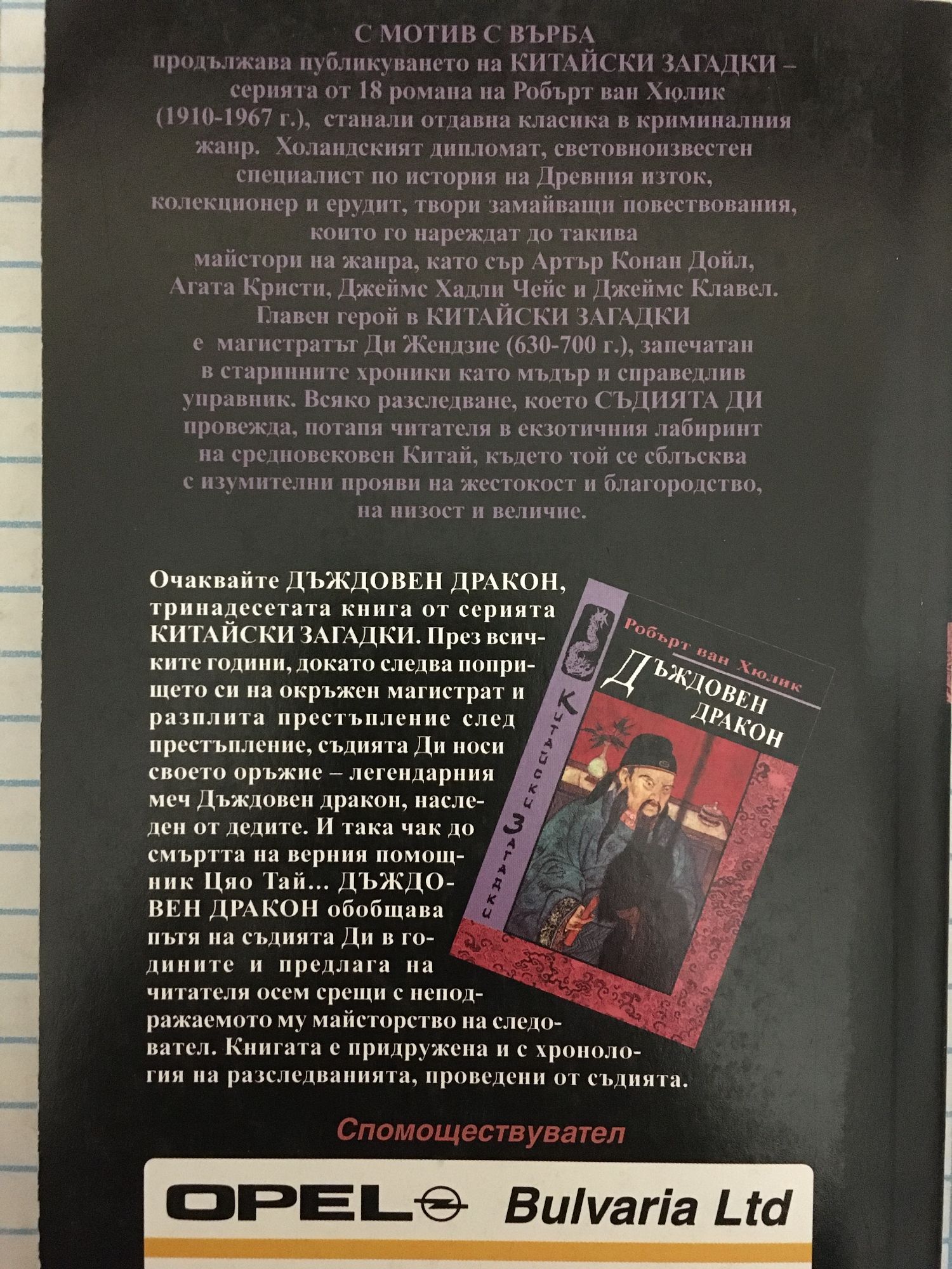 С "Мотив с върба" продължава публикуването на "Китайски загадки"-серията от 18 романа на Робърт ван Хюлик станали отдавна класика в криминалния жанр. Холандският дипломат, световноизвестен специалист по история на Древния изток, колекционер и ерудит, твори замайващи повествования, които го нареждат до такива майстори в жанра, като сър Артър Конан Дойл, Агата Кристи, Джеймс Хадли Чейс и джеймс Клавел. Главен герой в "Китайски загадки" е магистратът Ди Жендзие (630-700г.),запечатан в старинните хроники като мъдър и справедлив управник. Всяко разследване, което съдията Ди провежда, потапя читателя в екзотичния лабиринт на средновековен Китай, където той се сблъсква с изумителни прояви на жестокост и благородство, на низост и величие.
